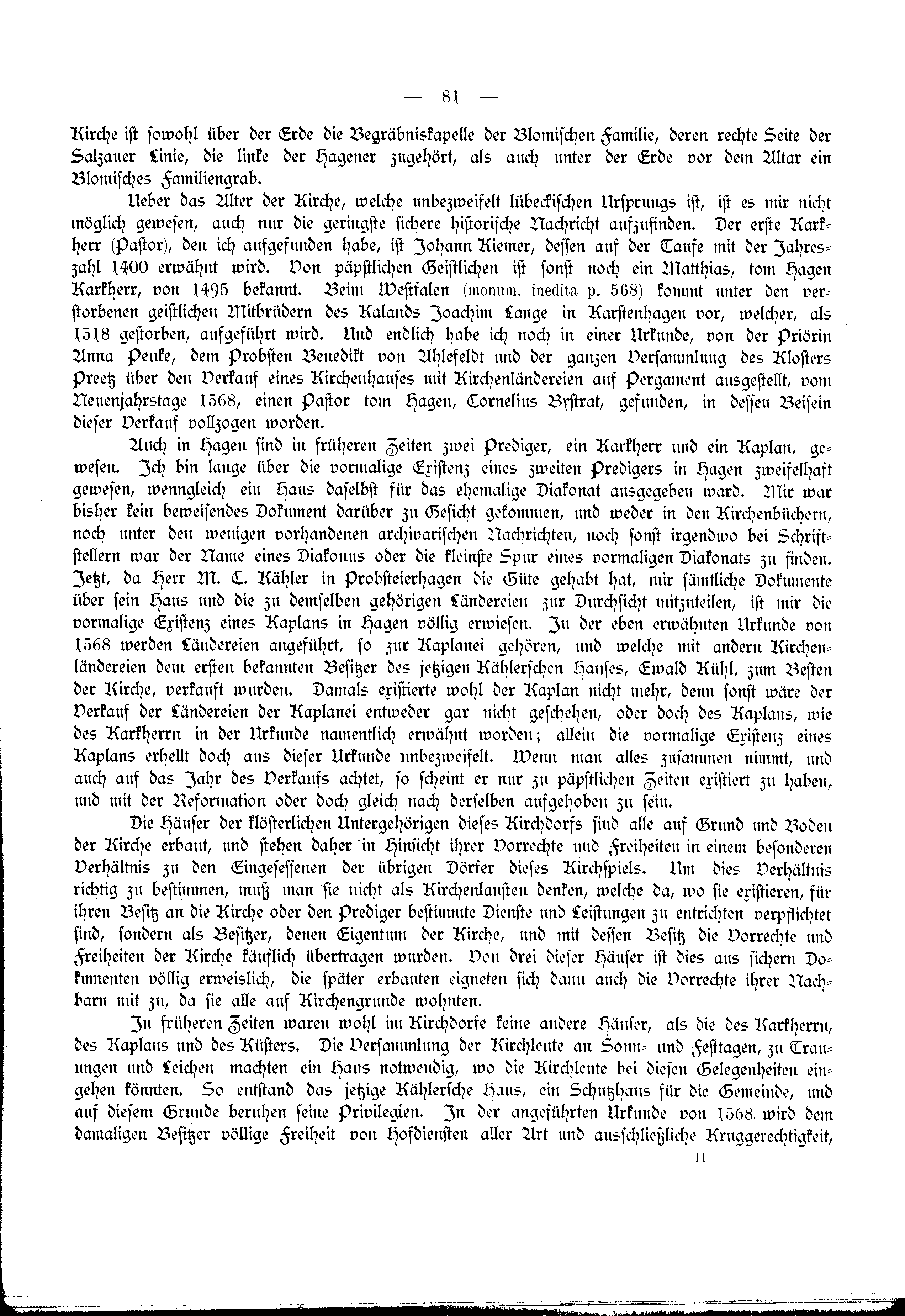 Auch in Hagen sind in früheren Zeiten zwei Prediger, ein Karkherr und ein Kaplan, gewesen. Ich bin lange über die vormalige Existenz eines zweiten Predigers in Hagen zweifelhaft gewesen, wenngleich ein Haus daselbst für das ehemalige Diakonat ausgegeben ward. Mir war bisher kein beweisendes Dokument darüber zu Gesicht gekommen, und weder in den Kirchenbüchern, noch unter den wenigen vorhandenen archivarischen Nachrichten, noch sonst irgendwo bei Schriftstellern war der Name eines Diakonus oder die kleinste Spur eines vormaligen Diakonats zu finden. Jetzt, da Herr M. C. Kähler in Probsteierhagen die Güte gehabt hat, nur sämtliche Dokumente über sein Haus und die zu demselben gehörigen Ländereien zur Durchsicht mitzuteilen, ist mir die vormalige Existenz eines Kaplans in Hagen völlig erwiesen. In der eben erwähnten Urkunde von 1568 werden Ländereien angeführt, so zur Kaplanei gehören, und welche mit andern Kirchenländereien dem ersten bekannten Besitzer des jetzigen Kählerschen Hauses, Ewald Kühl, zum Besten der Kirche, verkauft wurden. Damals existierte wohl der Kaplan nicht mehr, denn sonst wäre der Verkauf der Ländereien der Kaplanei entweder gar nicht geschehen, oder doch des Kaplans, wie des Karkherrn in der Urkunde namentlich erwähnt worden; allein die vormalige Existenz eines Kaplans erhellt doch aus dieser Urkunde unbezweifelt. Wenn man alles zusammen nimmt, und auch auf das Jahr des Verkaufs achtet, so scheint er nur zu päpstlichen Zeiten existiert zu haben, und mit der Reformation oder doch gleich nach derselben aufgehoben zu sein.