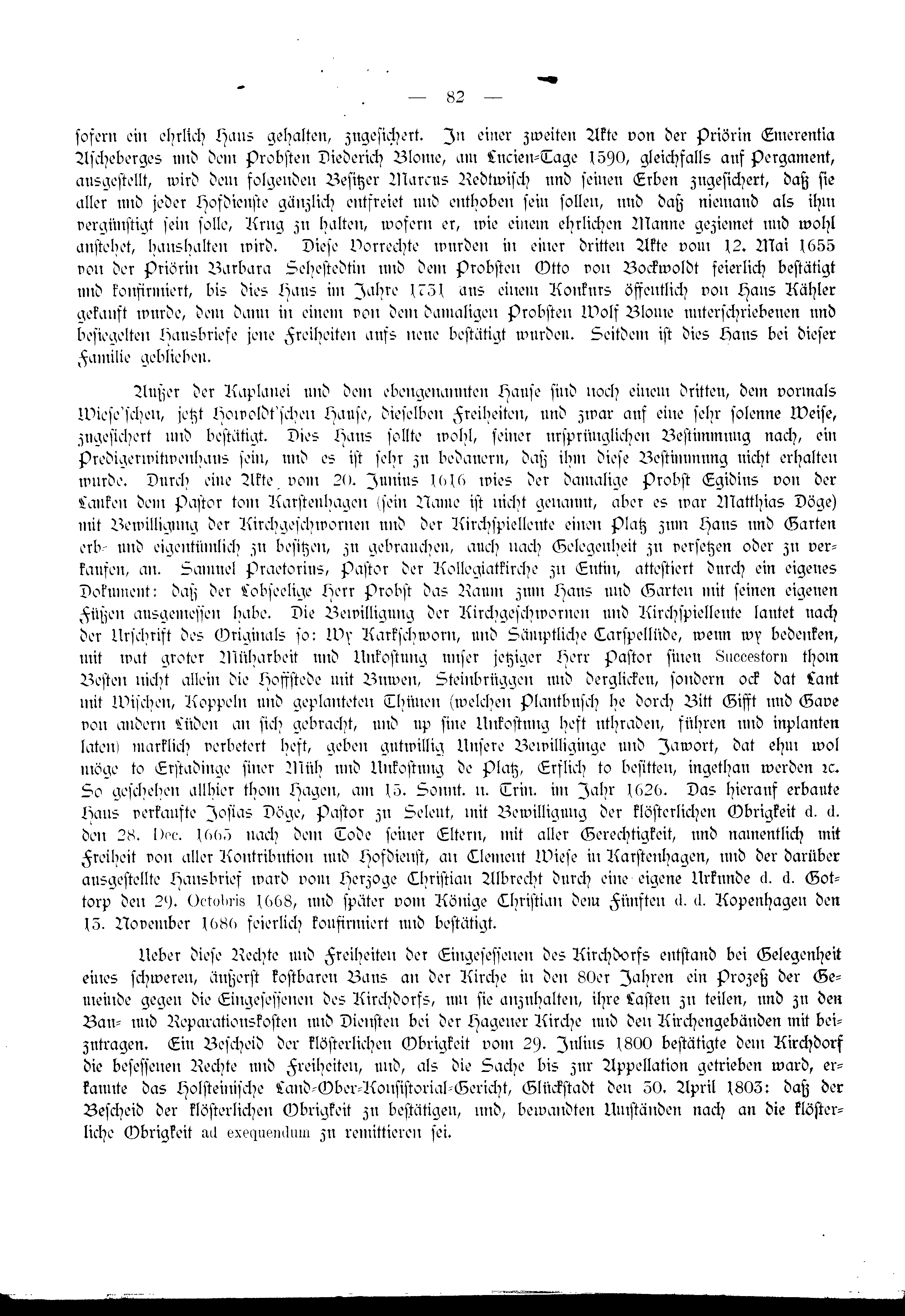 Außer der Kaplanei und dem ebengenannten Hause sind noch einem dritten, dem vormals Wiese'schen, jetzt Howoldt'schen Hause, dieselben Freiheiten, und zwar auf eine sehr solemne Weise, zugesichert und bestätigt. Dies Haus sollte wohl, seiner ursprünglichen Bestimmung nach, ein Predigerwitwenhaus sein, und es ist sehr zu bedauern, daß ihm diese Bestimmung nicht erhalten wurde. Durch eine Akte vom 20. Junius 1616 wies der damalige Probst Egidius von der Lanken dem Pastor tom Karstenhagen (sein Name ist nicht genannt, aber es war Matthias Döge) mit Bewilligung der Kirchgeschwornen und der Kirchspielleute einen Platz zum Haus und Garten erb- und eigentümlich zu besitzen, zu gebrauchen, auch nach Gelegenheit zu versetzen oder zu verkaufen, an. Samuel Praetorius, Pastor der Kollegiatkirche zu Eutin, attestiert durch ein eigenes Dokument: daß der Lobseelige Herr Probst das Raum zum Haus und Garten mit seinen eigenen Füßen ausgemessen habe. Die Bewilligung der Kirchgeschwornen und Kirchspielleute lautet nach der Urschrift des Originals so: W Karkschworn, und Sämptliche Carspellüde, wenn wy bedenken, mit wat groter Müharbeit und Unkostung unser jetziger Herr Pastor sinen Succestorn thom Besten nicht allein die Hoffstede mit Buwen, Steinbrüggen und derglicken, sondern ock dat Lant mit Wischen, Koppeln und geplanteten Thünen (welchen Plantbusch he dorch Bitt Gifft und Gave von andern Lüden an sich gebracht, und up sine Unkostung best uthraden, führen und inplanten laten marklich verbetert heft, geben gutwillig Unsere Bewilliginge und Jawort, dat ehm wol möge to Erstadinge siner Müh und Unkostung de Platz, Erflich to besitten, ingethan werden. So geschehen allhier thom Hagen, am 15. Sonnt. n. Trin. im Jahr 1626. Das hieraus erbaute Haus verkaufte Josias Döge, Pastor zu Selent, mit Bewilligung der klösterlichen Obrigkeit d.d. den 28. Dec. 1665 nach dem Tode seiner Eltern, mit aller Gerechtigkeit, und namentlich mit Freiheit von aller Kontribution und Hofdienst, an Clement Wiese in Karstenhagen, und der darüber ausgestellte Hausbrief ward vom Herzoge Christian Albrecht durch eine eigene Urkunde d.d. Gottorp den 29. Octobris 1668, und später vom Könige Christian dem Fünften d.d. Kopenhagen den 13. November 1686 feierlich konfirmiert und bestätigt.