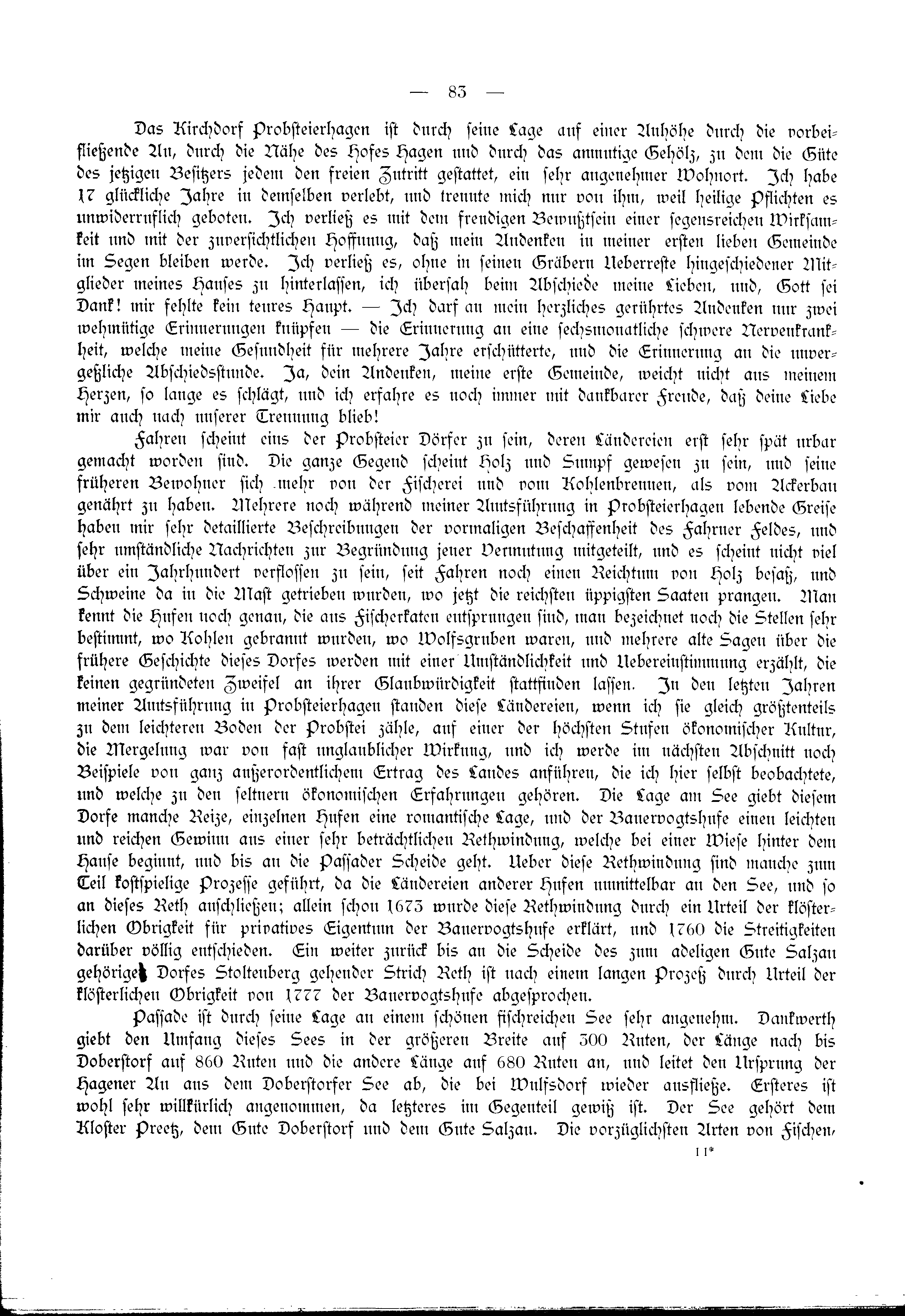 Das Kirchdorf Probsteierhagen ist durch seine Lage auf einer Anhöhe durch die vorbeifließende Au, durch die Nähe des Hofes Hagen und durch das anmutige Gehölz, zu dem die Güte des jetzigen Besitzers jedem den freien Zutritt gestattet, ein sehr angenehmer Wohnort. Ich habe 18 glückliche Jahre in demselben verlebt, und trennte mich nur von ihm, weil heilige Pflichten es unwiderruflich geboten. Ich verließ es mit dem freudigen Bewußtsein einer segensreichen Wirksamkeit und mit der zuversichtlichen Hoffnung, daß mein Andenken in meiner ersten lieben Gemeinde im Segen bleiben werde. Ich verließ es, ohne in seinen Gräbern Ueberreste hingeschiedener Mitglieder meines Hauses zu hinterlassen, ich übersah beim Abschiede meine Lieben und, Gott sei Dank! mir fehlte kein teures Haupt. - Ich darf an mein herzliches gerührtes Andenken nur zwei wehmütige Erinnerungen knüpfen - die Erinnerung an eine sechsmonatliche schwere Nervenkrankheit, welche meine Gesundheit für mehrere Jahre erschütterte, und die Erinnerung an die unvergeßliche Abschiedsstunde. Ja, dein Andenken, meine erste Gemeinde, weicht nicht aus meinem Herzen, so lange es schlägt, und ich erfahre es noch immer mit dankbarer Freude, daß deine Liebe mir auch nach unserer Trennung blieb!