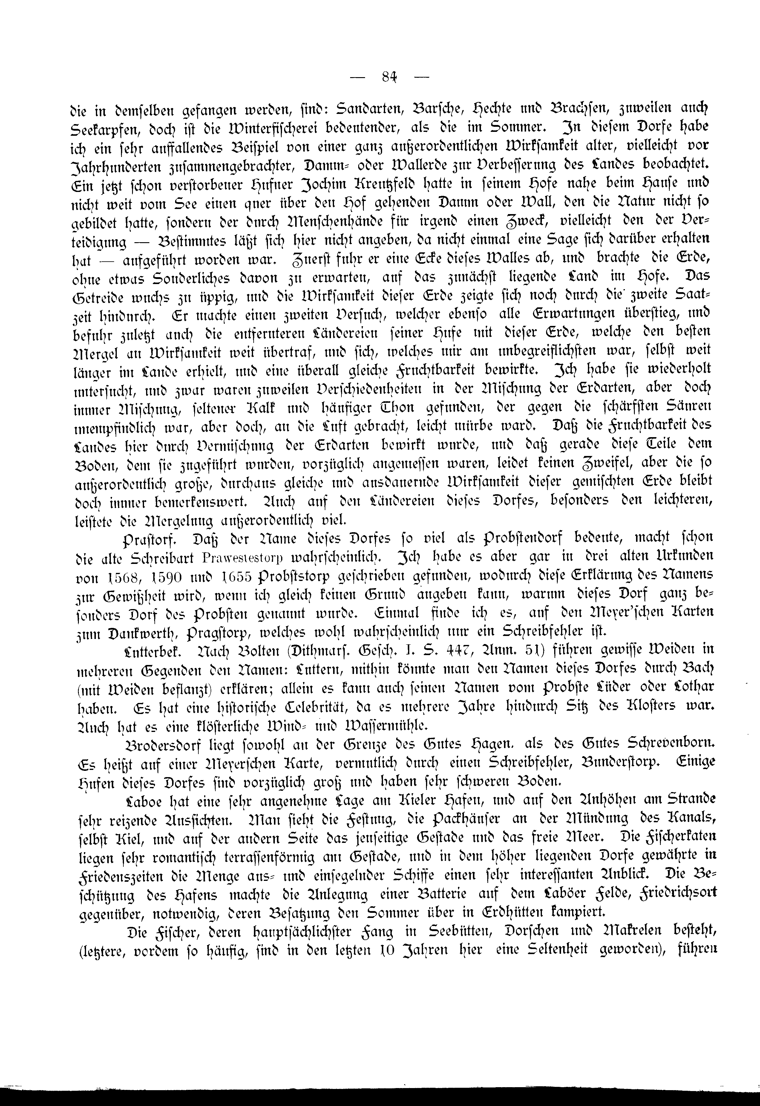 Prastorf. Daß der Name dieses Dorfes soviel als Probstendorf bedeute, macht schon die alte Schreibart Prawestestorp wahrscheinlich. Ich habe es aber gar in drei alten Urkunden von 1568, 1590 und 1655 Probststorp geschrieben gefunden, wodurch diese Erklärung des Namens zur Gewißheit wird, wenn ich gleich keinen Grund angeben kann, warum dieses Dorf ganz besonders Dorf des Probsten genannt wurde. Einmal finde ich es, auf den Meyer'schen Karten zum Dankwerth. Pragstorp, welches wohl wahrscheinlich nur ein Schreibfehler ist.