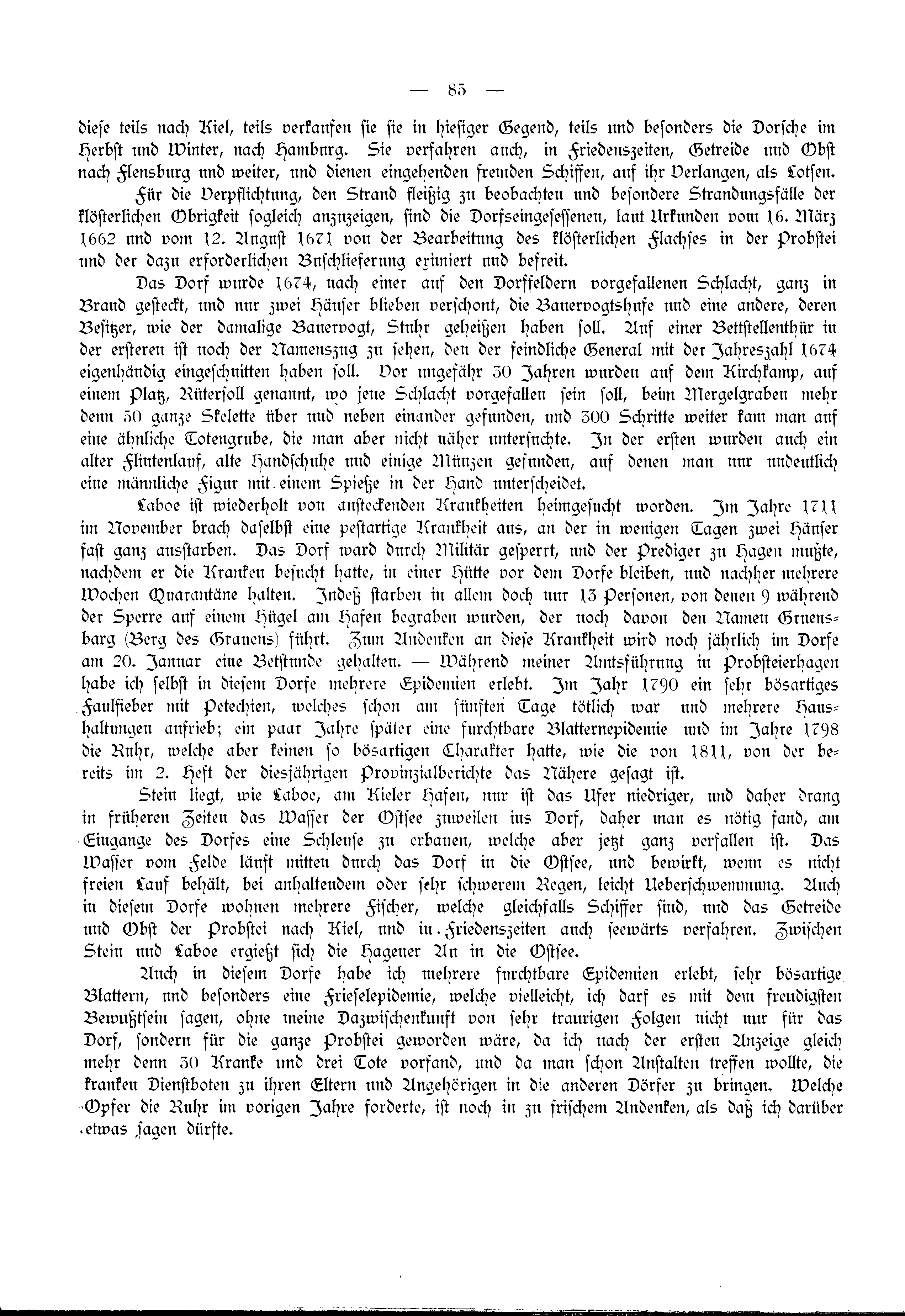 Laboe ist wiederholt von ansteckenden Krankheiten heimgesucht worden. Im Jahre 1711 im November brach daselbst eine pestartige Krankheit aus, an der in wenigen Tagen zwei Häuser fast ganz ausstarben. Das Dorf ward durch Militär gesperrt, und der Prediger zu Hagen mußte, nachdem er die Kranken besucht hatte, in einer Hütte vor dem Dorfe bleiben, und nachher mehrere Wochen Quarantäne halten. Indeß starben in allem doch nur 13 Personen,. von denen 9 während der Sperre auf einem Hügel am Hafen begraben wurden, der noch davon den Namen Gruensbarg (Berg des Grauens) führt. Zum Andenken an diese Krankheit wird noch jährlich im Dorfe am 20. Januar eine Betstunde gehalten. - Während meiner Amtsführung in Probsteierhagen habe ich selbst in diesem Dorfe mehrere Epidemien erlebt. Im Jahr1790 ein sehr bösartiges Faulfieber mit Petechien, welches schon am fünften Tage tötlich war und mehrere Haushaltungen aufrieb; ein paar Jahre später eine furchtbare Blatternepidemie und im Jahre 1798 die Ruhr, welche aber keinen so bösartigen Charakter hatte, wie die von 1811, von der bereits im 2. Heft der diesjährigen Provinzialberichte das Nähere gesagt ist.