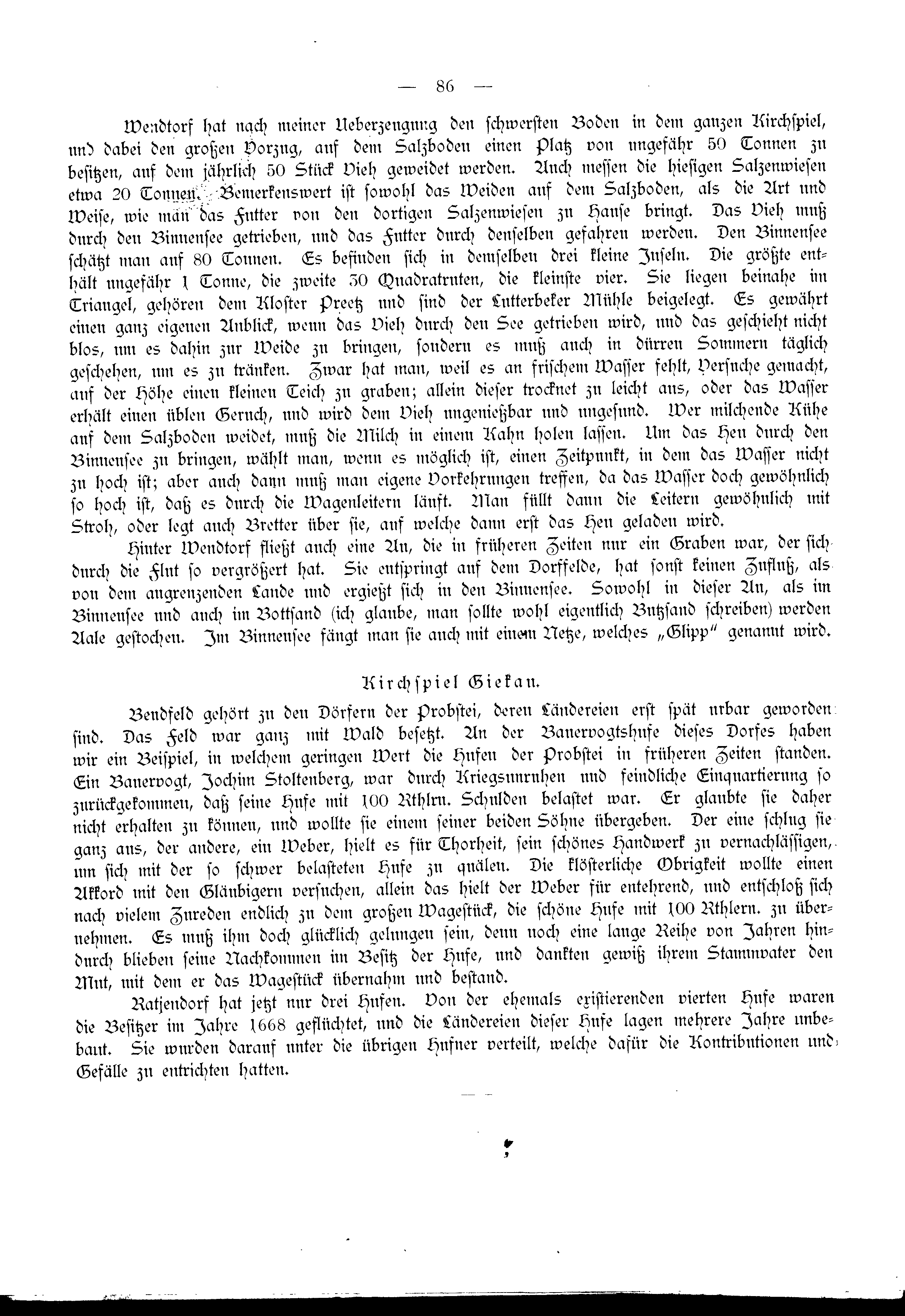Wendtorf hat nach meiner Ueberzeugung den schwersten Boden in dem ganzen Kirchspiel, und dabei den großen Vorzug, auf dem Salzboden einen Platz von ungefähr 50 Tonnen zu besitzen, auf dem jährlich 50 Stück Vieh geweidet werden. Auch messen die hiesigen Salzenwiesen etwa 20 Tonnen. Bemerkenswert ist sowohl das Weiden auf dem Salzboden, als die Art und Weise, wie man das Futter von den dortigen Salzenwiesen zu Hause bringt. Das Vieh muß durch den Binnensee getrieben, und das Futter durch denselben gefahren werden. Den Binnensee schätzt man auf 80 Tonnen. Es befinden sich in demselben drei kleine Inseln. Die größte enthält ungefähr 1 Tonne, die zweite 30 Quadratruten, die kleinste vier. Sie liegen beinahe im Triangel, gehören dem Kloster Preetz und sind der Lutterbeker Mühle beigelegt. Es gewährt einen ganz eigenen Anblick, wenn das Vieh durch den See getrieben wird, und das geschieht nicht blos, um es dahin zur Weide zu bringen, sondern es muß auch in dürren Sommern täglich geschehen, um es zu tränken. Zwar hat man, weil es an frischem Wasser fehlt, Versuche gemacht, aus der Höhe einen kleinen Teich zu graben; allein dieser trocknet zu leicht aus, oder das Wasser erhält einen üblen Geruch, und wird dem Vieh ungenießbar und ungesund. Wer milchende Kühe auf dem Salzboden weidet, muß die Milch in einem Kahn holen lassen. Um das Heu durch den Binnensee zu bringen, wählt man, wenn es möglich ist, einen Zeitpunkt, in dem das Wasser nicht zu hoch ist; aber auch dann muß man eigene Vorkehrungen treffen, da das Wasser doch gewöhnlich so hoch ist, daß es durch die Wagenleitern läuft. Man füllt dann die Leitern gewöhnlich mit Stroh, oder legt auch Bretter über sie, auf welche dann erst das Heu geladen wird. Hinter Wendtorf fließt auch eine Au, die in früheren Zeiten nur ein Graben war, der sich durch die Flut so vergrößert hat. Sie entspringt auf dem Dorffelde, hat sonst keinen Zufluß, als von dem angrenzenden Lande und ergießt sich in den Binnensee. Sowohl in dieser Au, als im Binnensee und auch im Bottsand (ich glaube, man sollte wohl eigentlich Butzsand schreiben) werden Aale gestochen. Im Binnensee fängt man sie auch mit einem Netze, welches „Glipp“ genannt wird.
