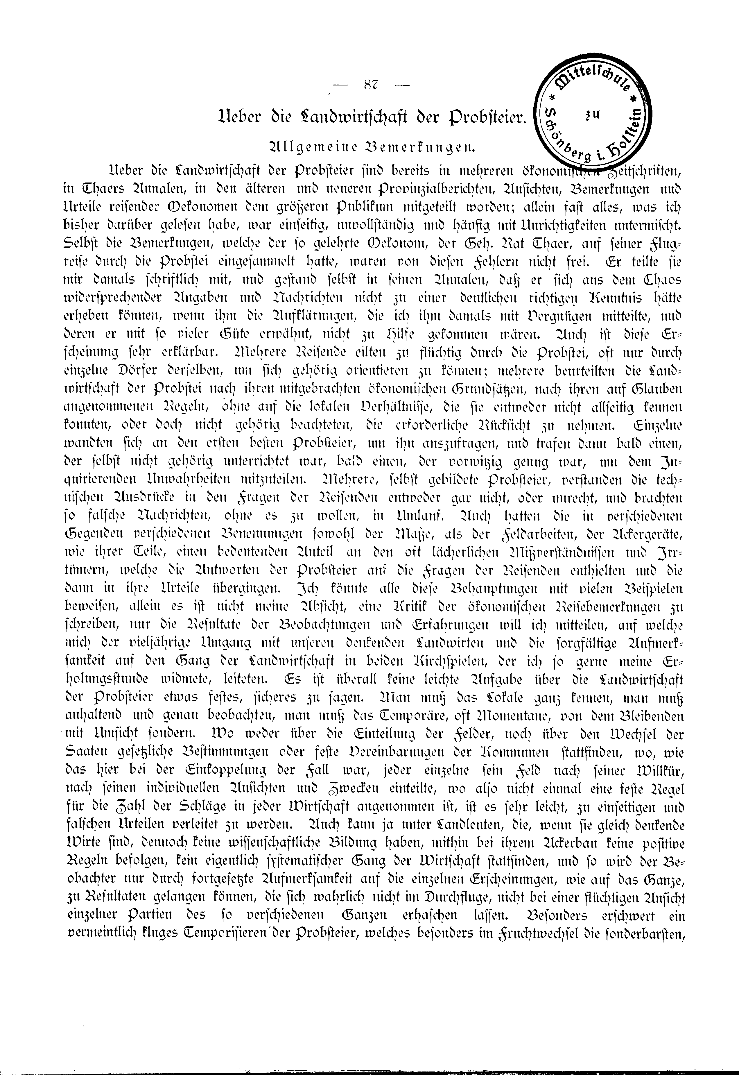 Ueber die Landwirtschaft der Probsteier sind bereits in mehreren ökonomischen Zeitschriften, in Thaers Annalen, in den älteren und neueren Provinzialberichten, Ansichten, Bemerkungen und Urteile reisender Oekonomen dem größeren Publikum mitgeteilt worden; allein fast alles, was ich bisher darüber gelesen habe, war einseitig, unvollständig und häufig mit Unrichtigkeiten untermischt. Selbst die Bemerkungen, welche der so gelehrte Oekonom, der Geh. Rat Thaer, auf seiner Flugreise durch die Probstei eingesammelt hatte, waren von diesen Fehlern nicht frei. Er teilte sie nur damals schriftlich mit, und gestand selbst in seinen Annalen, daß er sich aus dem Chaos widersprechender Angaben und Nachrichten nicht zu einer deutlichen richtigen Kenntnis hätte erheben können, wenn ihm die Aufklärungen, die ich ihm damals mit Vergnügen mitteilte, und deren er mit so vieler Güte erwähnt, nicht zu Hilfe gekommen wären. Auch ist diese Erscheinung sehr erklärbar. Mehrere Reisende eilten zu flüchtig durch die Probstei, oft nur durch einzelne Dörfer derselben, um sich gehörig orientieren zu können; mehrere beurteilten die Landwirtschaft der Probstei nach ihren mitgebrachten ökonomischen Grundsätzen, nach ihren auf Glauben angenommenen Regeln, ohne auf die lokalen Verhältnisse, die sie entweder nicht allseitig kennen konnten, oder doch nicht gehörig beachteten, die erforderliche Rücksicht zu nehmen. Einzelne wandten sich an den ersten besten Probsteier, tun ihn auszufragen, und trafen dann bald einen, der selbst nicht gehörig unterrichtet war, bald einen, der vorwitzig genug war, um dem Inquirierenden Unwahrheiten mitzuteilen. Mehrere, selbst gebildete Probsteier, verstanden die technischen Ausdrücke in den Fragen der Reisenden entweder gar nicht, oder unrecht, und brachten so falsche Nachrichten, ohne es zu wollen, in Umlauf. Auch hatten die in verschiedenen Gegenden verschiedenen Benennungen sowohl der Maße, als der Feldarbeiten, der Ackergeräte, wie ihrer Teile, einen bedeutenden Anteil an den oft lächerlichen Mißverständnissen und Irrtümern, welche die Antworten der Probsteier auf die Fragen der Reisenden enthielten und die dann in ihre Urteile übergingen. Ich könnte alle diese Behauptungen mit vielen Beispielen beweisen, allein es ist nicht meine Absicht, eine Kritik der ökonomischen Reisebemerkungen zu schreiben, nur die Resultate der Beobachtungen und Erfahrungen will ich mitteilen, auf welche mich der vieljährige Umgang mit unseren denkenden Landwirten und die sorgfältige Aufmerksamkeit auf den Gang der Landwirtschaft in beiden Kirchspielen, der ich so gerne meine Erholungsstunde widmete, leiteten. Es ist überall keine leichte Ausgabe über die Landwirtschaft der Probsteier etwas festes, sicheres zu sagen. Man muß das Lokale ganz kennen, man muß anhaltend und genau beobachten, man muß das Temporäre, oft Momentane, von dem Bleibenden mit Umsicht sondern. Wo weder über die Einteilung der Felder, noch über den Wechsel der Saaten gesetzliche Bestimmungen oder feste Vereinbarungen der Kommunen stattfinden, wo, wie das hier bei der Einkoppelung der Fall war, jeder einzelne sein Feld nach seiner Willkür, nach seinen individuellen Ansichten und Zwecken einteilte, wo also nicht einmal eine feste Regel für die Zahl der Schläge in jeder Wirtschaft angenommen ist, ist es sehr leicht, zu einseitigen und falschen Urteilen verleitet zu werden. Auch kann ja unter Landleuten, die, wenn sie gleich denkende Wirte sind, dennoch keine wissenschaftliche Bildung haben, mithin bei ihrem Ackerbau keine positive Regeln befolgen, kein eigentlich systematischer Gang der Wirtschaft stattfinden, und so wird der Beobachter nur durch fortgesetzte Aufmerksamkeit auf die einzelnen Erscheinungen, wie auf das Ganze, zu Resultaten gelangen können, die sich wahrlich nicht im Durchfluge, nicht bei einer flüchtigen Ansicht einzelner Partien des so verschiedenen Ganzen erhaschen lassen. Besonders erschwert ein vermeintlich kluges Temporisieren der Probsteier, welches besonders im Fruchtwechsel die sonderbarsten,