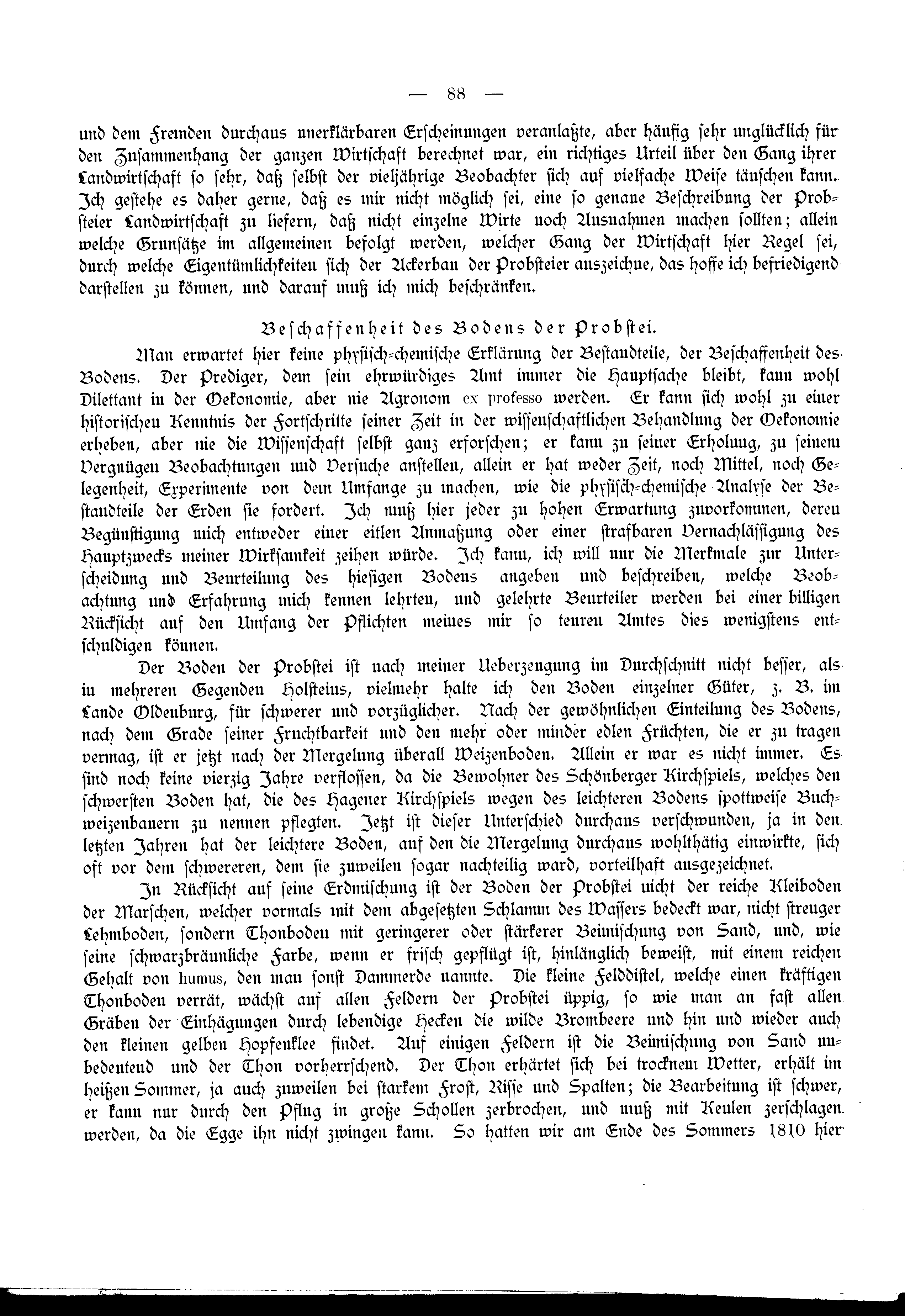 Der Boden der Probstei ist nach meiner Ueberzeugung im Durchschnitt nicht besser, als in mehreren Gegenden Holsteins, vielmehr halte ich den Boden einzelner Güter, z.B. im Lande Oldenburg, für schwerer und vorzüglicher. Nach der gewöhnlichen Einteilung des Bodens, nach dem Grade seiner Fruchtbarkeit und den mehr oder minder edlen Früchten, die er zu tragen vermag, ist er jetzt nach der Mergelung überall Weizenboden. Allein er war es nicht immer. Es sind noch keine vierzig Jahre verflossen, da die Bewohner des Schönberger Kirchspiels, welches den schwersten Boden hat, die des Hagener Kirchspiels wegen des leichteren Bodens spottweise Buchweizenbauern zu nennen pflegten. Jetzt ist dieser Unterschied durchaus verschwunden, ja in den letzten Jahren hat der leichtere Boden, auf den die Mergelung durchaus wohlthätig einwirkte, sich oft vor dem schwereren, dem sie zuweilen sogar nachteilig ward, vorteilhaft ausgezeichnet.