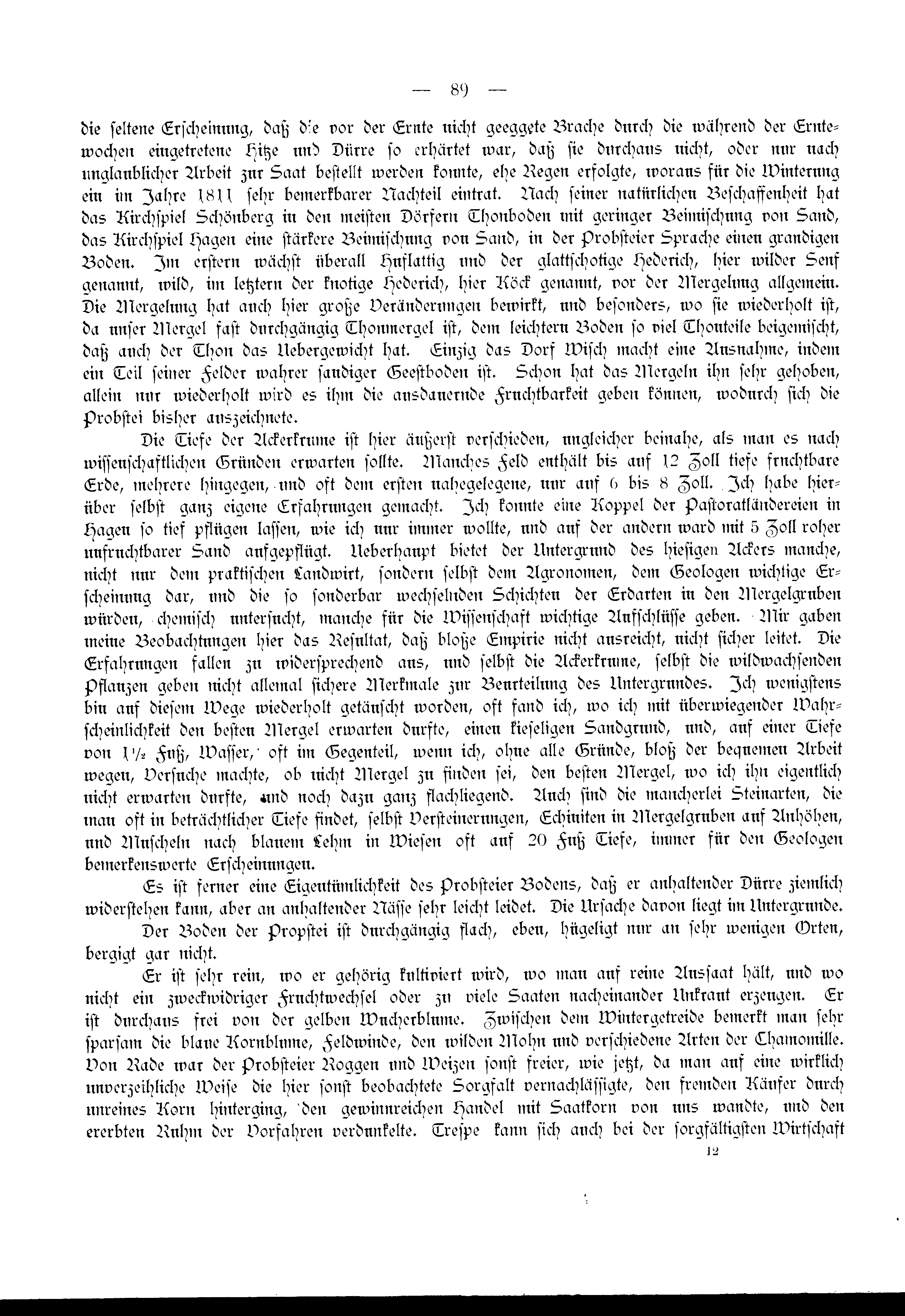 die seltene Erscheinung, daß die vor der Ernte nicht geeggte Brache durch die während der Erntewochen eingetretene Hitze und Dürre so erhärtet war, daß sie durchaus nicht, oder nur nach unglaublicher Arbeit zur Saat bestellt werden konnte, ehe Regen erfolgte, woraus für die Winterung ein im Jahre 1811 sehr bemerkbarer Nachteil eintrat. Nach seiner natürlichen Beschaffenheit hat das Kirchspiel Schönberg in den meisten Dörfern Thonboden mit geringer Beimischung von Sand, das Kirchspiel Hagen eine stärkere Beimischung von Sand, in der Probsteier Sprache einen grandigen Boden. Im erstern wächst überall Huflattig und der glattschotige Hederich, hier wilder Senf genannt, wild, im letztern der knotige Hederich, hier Köck genannt, vor der Mergelung allgemein. Die Mergelung hat auch hier große Veränderungen bewirkt, und besonders, wo sie wiederholt ist, da unser Mergel fast durchgängig Thonmergel ist, dem leichtern Boden so viel Thonteile beigemischt, daß auch der Thon das Uebergewicht hat. Einzig das Dorf Wisch macht eine Ausnahme, indem ein Teil seiner Felder wahrer sandiger Geestboden ist. Schon hat das Mergeln ihn sehr gehoben, allein nur wiederholt wird es ihm die ausdauernde Fruchtbarkeit geben können, wodurch sich die Probstei bisher auszeichnete.