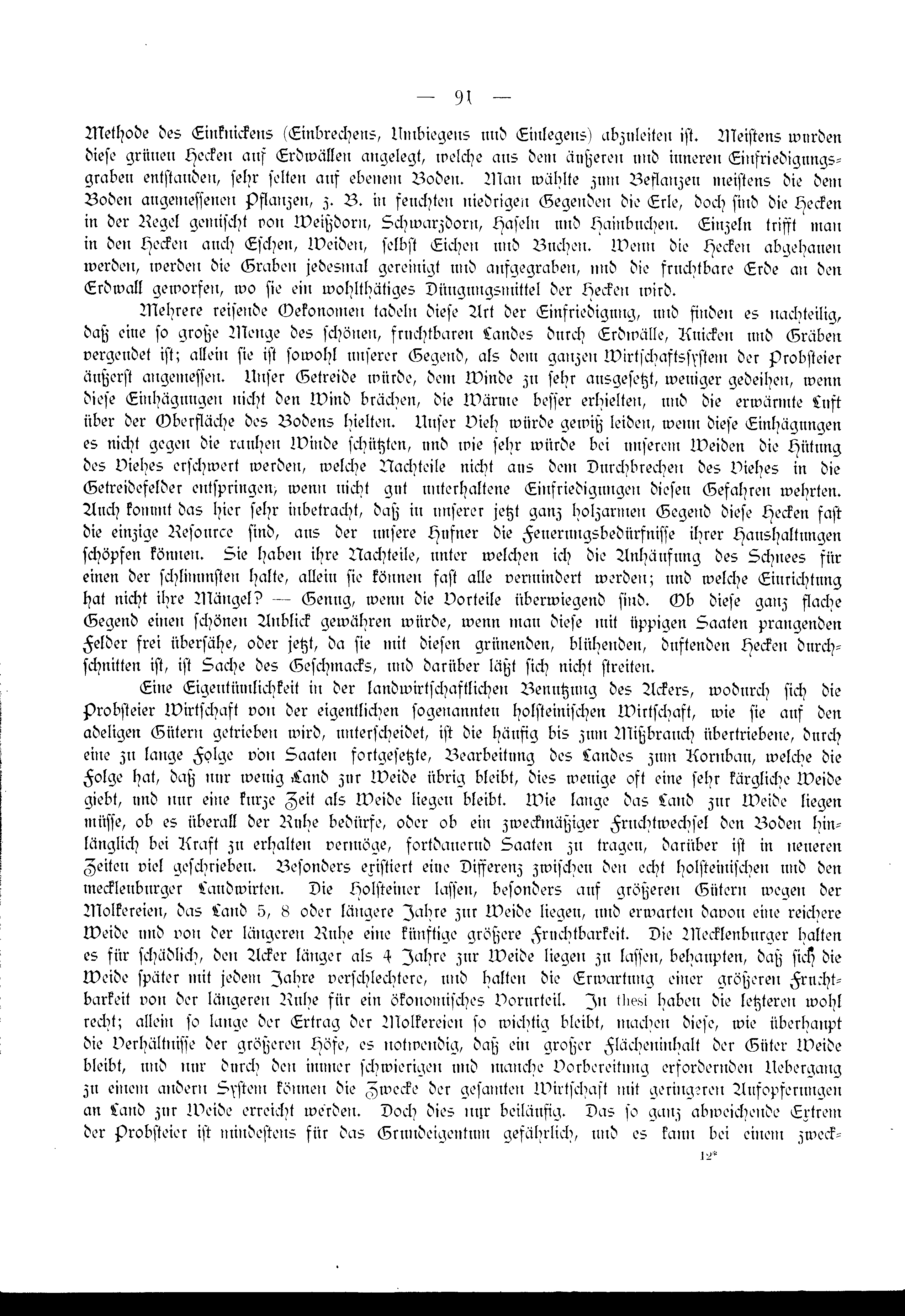 Mehrere reisende Oekonomen tadeln diese Art der Einfriedigung, und finden es nachteilig, daß eine so große Menge des schönen, fruchtbaren Landes durch Erdwälle, Knicken und Gräben vergeudet ist; allein sie ist sowohl unserer Gegend, als dem ganzen Wirtschaftssystem der Probsteier äußerst angemessen. Unser Getreide würde, dem Winde zu sehr ausgesetzt, weniger gedeihen, wenn diese Einwägungen nicht den Wind brächen, die Wärme besser erhielten, und die erwärmte Luft über der Oberfläche des Bodens hielten. Unser Vieh würde gewiß leiden, wenn diese Einhägungen es nicht gegen die rauhen Winde schützten, und wie sehr würde bei unserem Weiden die Hütung des Viehes erschwert werden, welche Nachteile nicht aus dem Durchbrechen des Viehes in die Getreidefelder entspringen, wenn nicht gut unterhaltene Einfriedigungen diesen Gefahren wehrten. Auch kommt das hier sehr inbetracht, daß in unserer jetzt ganz holzarmen Gegend diese Hecken fast die einzige Resource sind, aus der unsere Hufner die Feuerungsbedürfnisse ihrer Haushaltungen schöpfen können. Sie haben ihre Nachteile, unter welchen ich die Anhäufung des Schnees für einen der schlimmsten halte, allein sie können fast alle vermindert werden; und welche Einrichtung hat nicht ihre Mängel? - Genug, wenn die Vorteile überwiegend sind. Ob diese ganz flache Gegend einen schönen Anblick gewähren würde, wenn man diese mit üppigen Saaten prangenden Felder frei übersähe, oder jetzt, da sie mit diesen grünenden, blühenden, duftenden Hecken durchschnitten ist, ist Sache des Geschmacks, und darüber läßt sich nicht streiten.