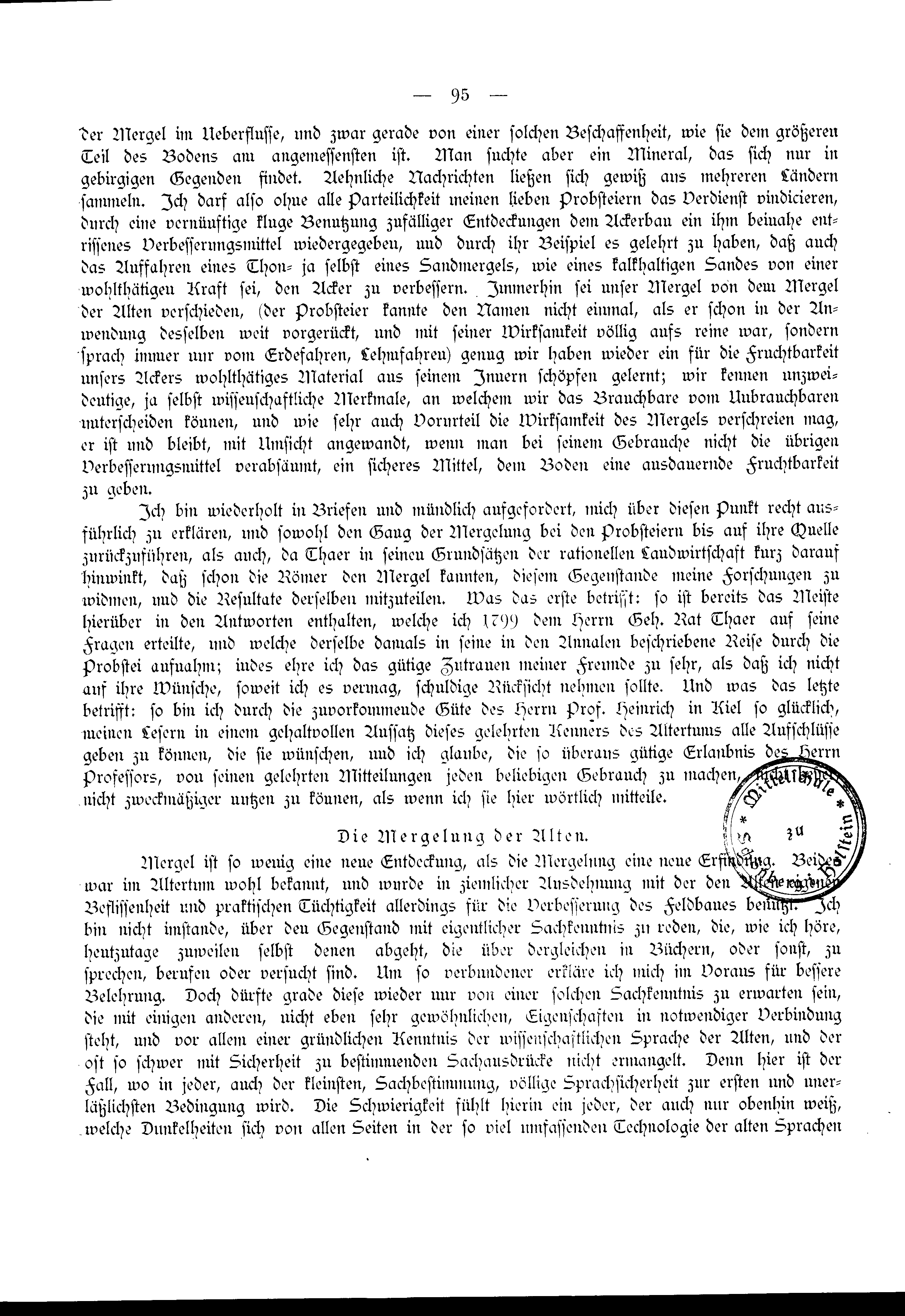 Ich bin wiederholt in Briefen und mündlich ausgefordert, mich über diesen Punkt recht ausführlich zu erklären, und sowohl den Gang der Mergelung bei den Probsteiern bis auf ihre Quelle zurückzuführen, als auch, da Thaer in seinen Grundsätzen der rationellen Landwirtschaft kurz darauf hinwinkt, daß schon die Römer den Mergel kannten, diesem Gegenstande meine Forschungen zu widmen, und die Resultate derselben mitzuteilen. Was das erste betrifft: so ist bereits das Meiste hierüber in den Antworten enthalten, welche ich 1799 dem Herrn Geh. Rat Thaer auf seine Fragen erteilte, und welche derselbe damals in seine in den Annalen beschriebene Reise durch die Probstei aufnahm; indes ehre ich das gütige Zutrauen meiner Freunde zu sehr, als daß ich nicht auf ihre Wünsche, soweit ich es vermag, schuldige Rücksicht nehmen sollte. Und was das letzte betrifft: so bin ich durch die zuvorkommende Güte des Herrn Prof. Heinrich in Kiel so glücklich, meinen Lesern in einem gehaltvollen Aufsatz dieses gelehrten Kenners des Altertums alle Aufschlüsse geben zu können, die sie wünschen, und ich glaube, die so überaus gütige Erlaubnis des Herrn Professors, von seinen gelehrten Mitteilungen jeden beliebigen Gebrauch zu machen, nicht besser, nicht zweckmäßiger nutzen zu können, als wenn ich sie hier wörtlich mitteile.