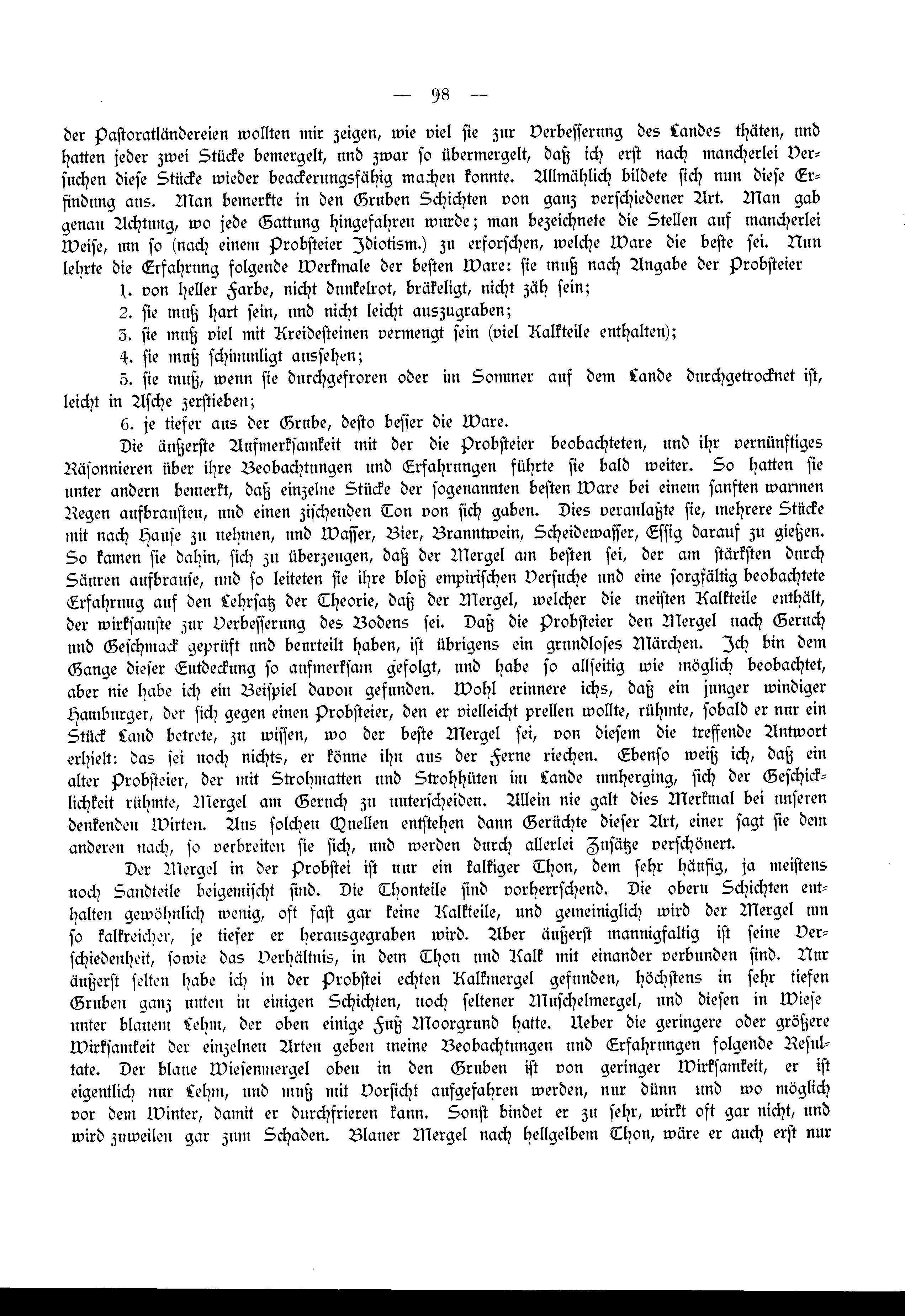 der Pastoratländereien wollten mir zeigen, wie viel sie zur Verbesserung des Landes thäten, und hatten jeder zwei Stücke bemergelt, und zwar so übermergelt, daß ich erst nach mancherlei Versuchen diese Stücke wieder beackerungsfähig machen konnte. Allmählich bildete sich nun diese Erfindung aus. Man bemerkte in den Gruben Schichten von ganz verschiedener Art. Man gab genau Achtung, wo jede Gattung hingefahren wurde; man bezeichnete die Stellen auf mancherlei Weise, um so (nach einem Probsteier Idiotism.) zu erforschen, welche Ware die beste sei. Nun lehrte die Erfahrung folgende Werkmale der besten Ware: sie muß nach Angabe der Probsteier