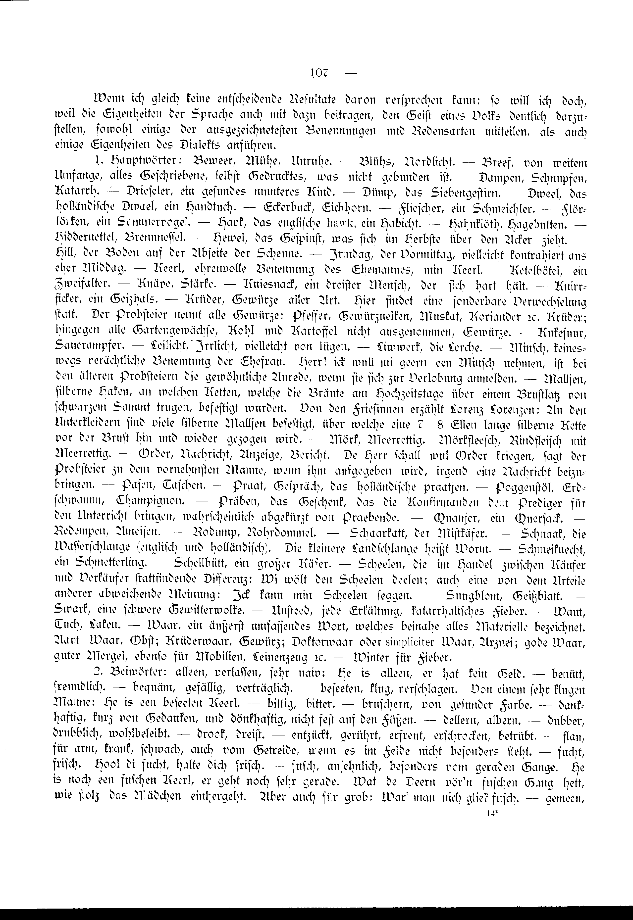 Wenn ich gleich keine entscheidende Resultate davon versprechen kann: so will ich doch, weil die Eigenheiten der Sprache auch mit dazu beitragen, den Geist eines Volks deutlich darzustellen, sowohl einige der ausgezeichnetesten Benennungen und Redensarten mitteilen, als auch einige Eigenheiten des Dialekts anführen.
