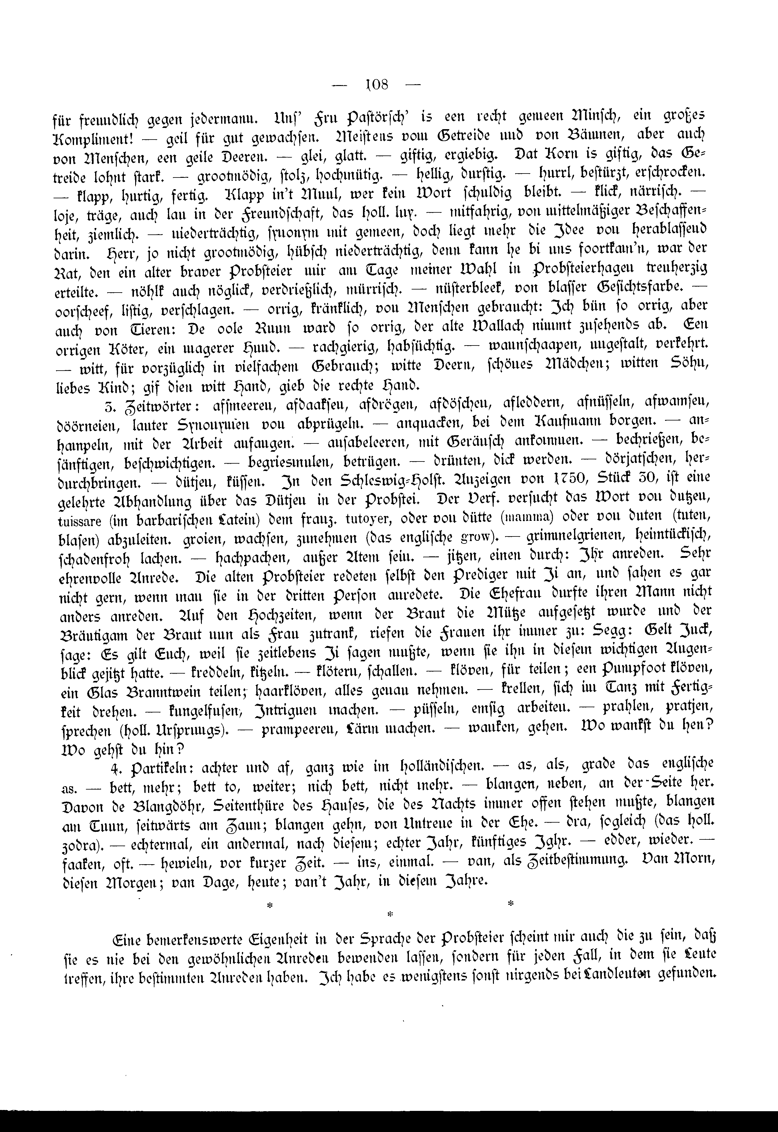 3. Zeitwörter: afsmeeren, afdaaksen, afdrögen, afdöschen, afleddern, afnüsseln, afwamsen, döörneien, lauter Synonymen von abprügeln. - anquacken, bei dem Kaufmann borgen. - anhampeln, mit der Arbeit anfangen. - ansabeleeren, mit Geräusch ankommen. - bechrießen, besänftigen, beschwichtigen. - begriesmulen, betrügen. - drünten, dick werden. - dörjatschen, herdurchbringen. - dütjen, küssen. In den Schleswig-Holst. Anzeigen von 1750, Stück 30, ist eine gelehrte Abhandlung über das Dütjen in der Probstei. Der Verf. versucht das Wort von dutzen, tuissare (im barbarischen Latein) dem franz. Tutoyer, oder von dütte (mamma) oder von duten (tuten, blasen) abzuleiten. groien, wachsen, zunehmen (das englische grow). - grimmelgrienen, heimtückisch, schadensroh lachen. - hachpachen, außer Atem sein. - jitzen, einen durch: Ihr anreden. Sehr ehrenvolle Anrede. Die alten Probsteier redeten selbst den Prediger mit Ji an, und sahen es gar nicht gern, wenn man sie in der dritten Person anredete. Die Ehefrau durfte ihren Mann nicht anders anreden. Auf den Hochzeiten, wenn der Braut die Mütze aufgesetzt wurde und der Bräutigam der Braut nun als Frau zutrank, riefen die Frauen ihr immer zu: Segg: Gelt Juck, sage: Es gilt Euch, weil sie zeitlebens Ji sagen mußte, wenn sie ihn in diesem wichtigen Augenblick gejitzt hatte. - kreddeln, kitzeln. - klötern, schallen. - klöven, für teilen ; een Pumpfoot klöven, ein Glas Branntwein teilen; haarklöven, alles genau nehmen. - krellen, sich im Tanz mit Fertigkeit drehen. - kungelfusen, Intriguen machen. - pusseln, emsig arbeiten. - prahlen, pratjen, sprechen (holl. Ursprungs). - prampeeren, Lärm machen. - wanken, gehen. Wo wankst du hen? Wo gehst du hin?
