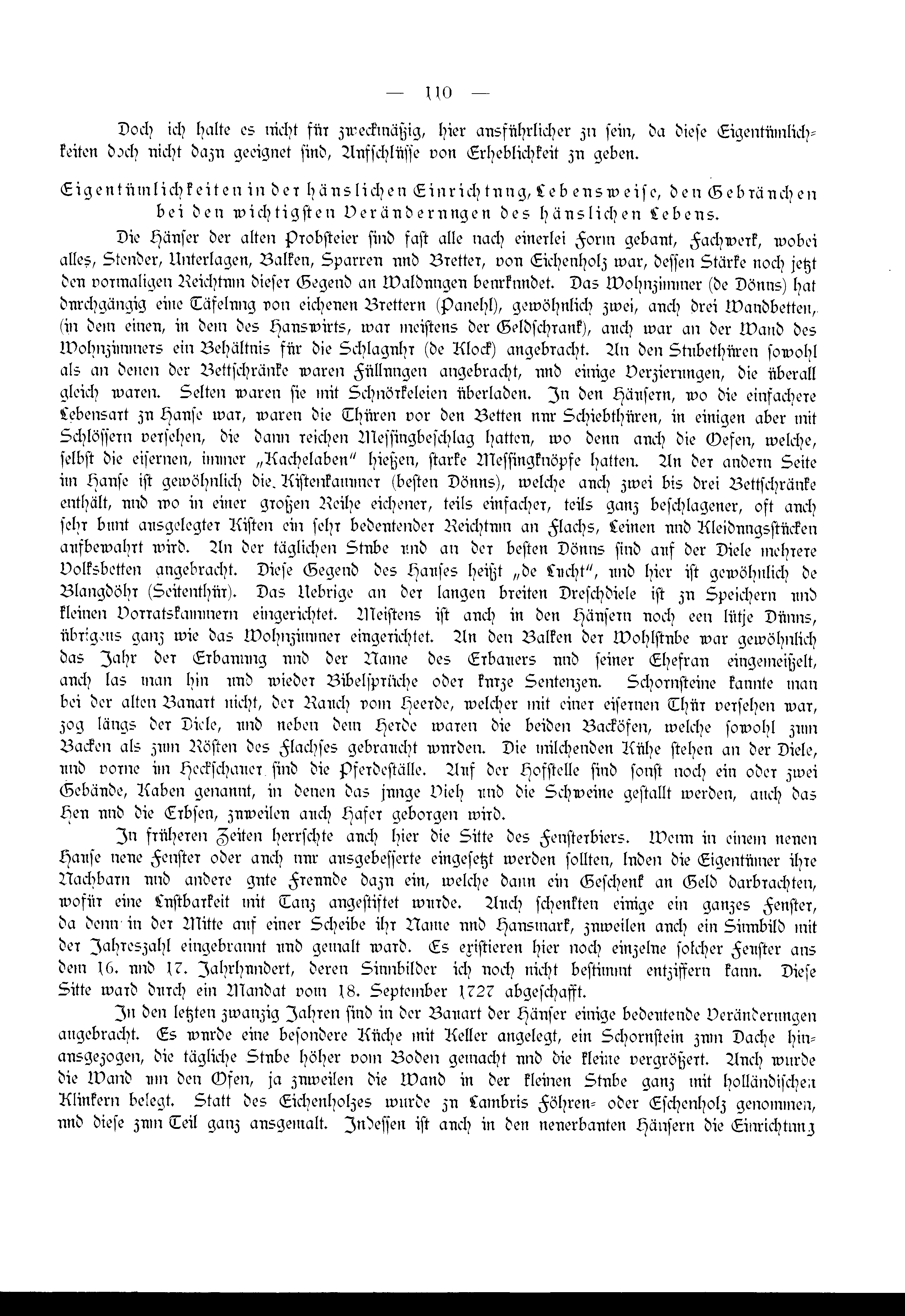 In den letzten zwanzig Jahren sind in der Bauart der Häuser einige bedeutende Veränderungen angebracht. Es wurde eine besondere Küche mit Keller angelegt, ein Schornstein zum Dache hinausgezogen, die tägliche Stube höher vom Boden gemacht und die kleine vergrößert. Auch wurde die Wand um den Ofen, ja zuweilen die Wand in der kleinen Stube ganz mit holländischen Klinkern belegt. Statt des Eichenholzes wurde zu Lambris Föhren- oder Eschenholz genommen, und diese zum Teil ganz ausgemalt. Indessen ist auch in den neuerbauten Häusern die Einrichtung