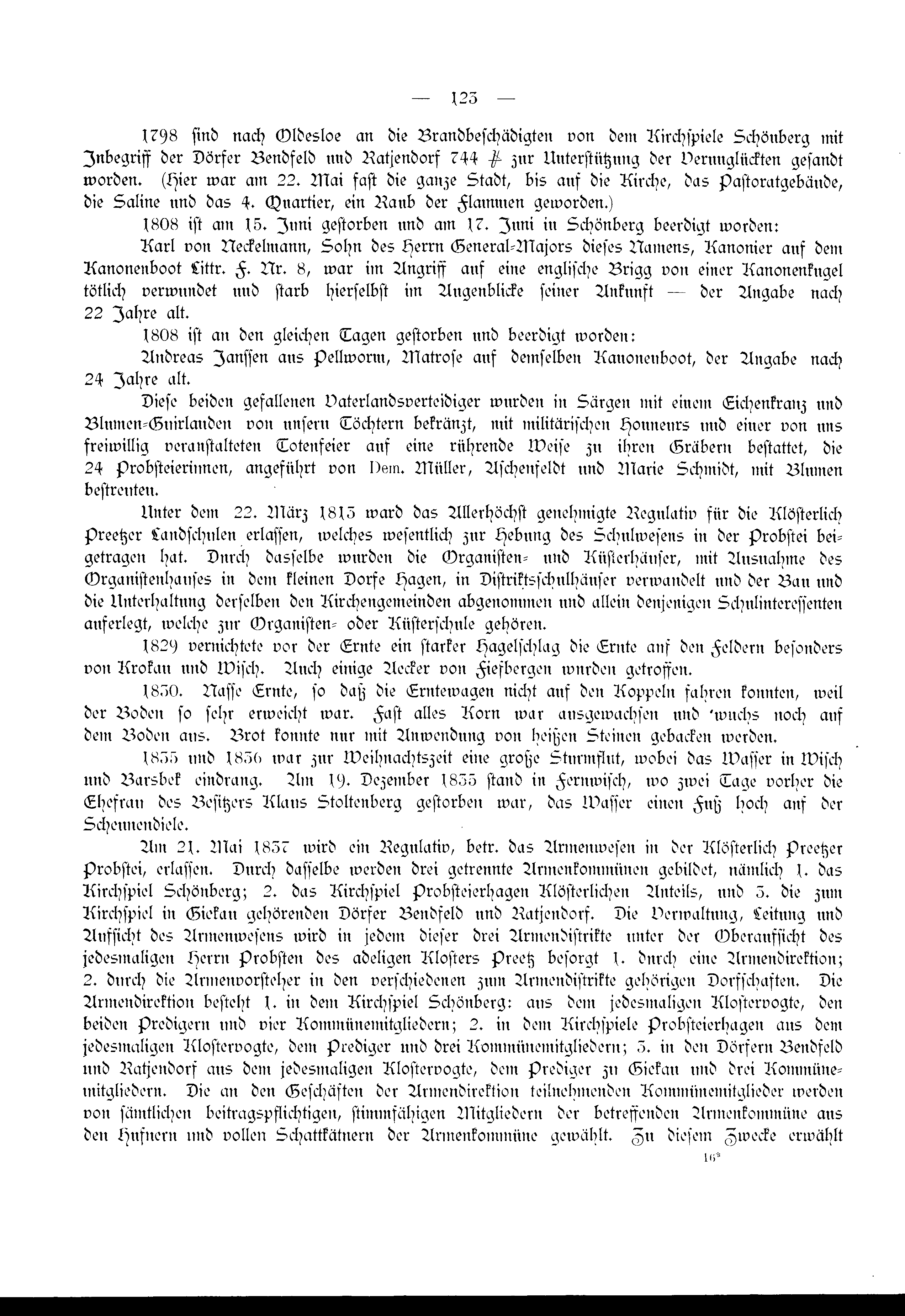 Am 21. Mai 1837 wird ein Regulativ, betr. das Armenwesen in der Klösterlich Preetzer Probstei, erlassen. Durch dasselbe werden drei getrennte Armenkommünen gebildet, nämlich 1. das Kirchspiel Schönberg; 2. das Kirchspiel Probsteierhagen Klösterlichen Anteils, und 3. die zum Kirchspiel in Giekau gehörenden Dörfer Bendfeld und Ratjendorf. Die Verwaltung, Leitung und Aufsicht des Armenwesens wird in jedem dieser drei Armendistrikte unter der Oberaufsicht des jedesmaligen Herrn Probsten des adeligen Klosters Preetz besorgt 1. durch eine Armendirektion; 2. durch die Armenvorsteher in den verschiedenen zum Armendistrikte gehörigen Dorfschaften. Die Armendirektion besteht 1. in dem Kirchspiel Schönberg: aus dem jedesmaligen Klostervogte, den beiden Predigern und vier Kommünemitgliedern; 2. in dem Kirchspiele Probsteierhagen aus dem jedesmaligen Klostervogte, dem Prediger und drei Kommünemitgliedern; 3. in den Dörfern Bendfeld und Ratjendorf aus dem jedesmaligen Klostervogte, dem Prediger zu Giekau und drei Kommünemitgliedern. Die an den Geschäften der Armendirektion teilnehmenden Kommünemitglieder werden von sämtlichen beitragspflichtigen, stimmfähigen Mitgliedern der betreffenden Armenkommüne aus den Hufnern und vollen Schattkätnern der Armenkommüne gewählt. Zu diesem Zwecke erwählt