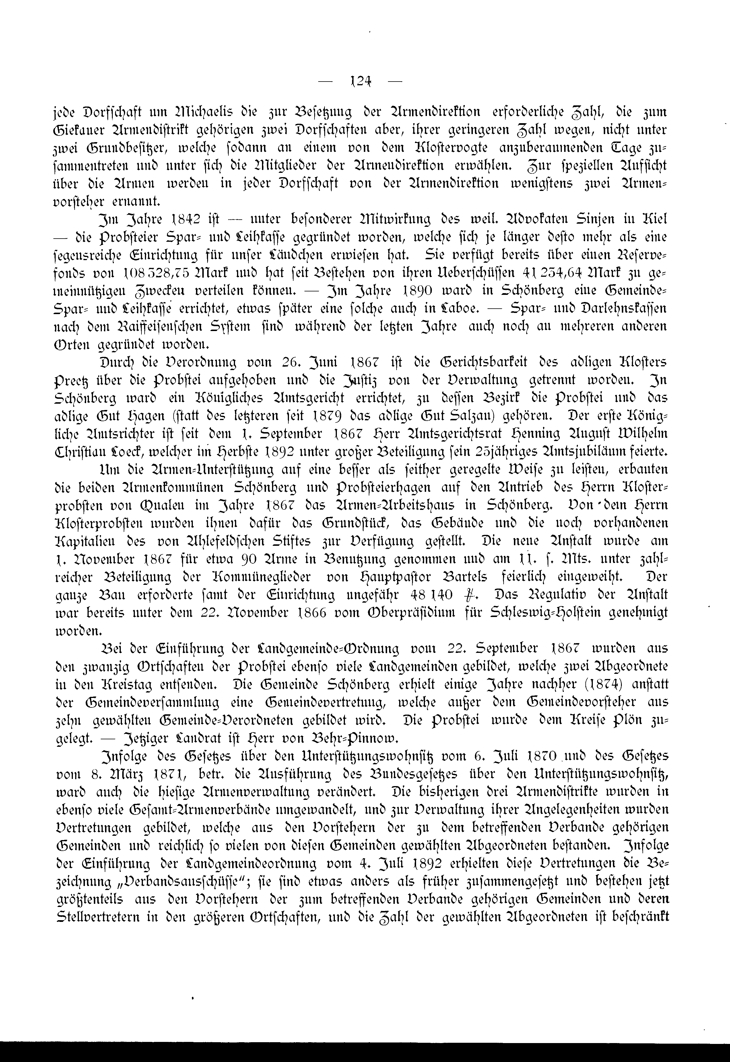 Um die Armen-Unterstützung auf eine besser als seither geregelte Weise zu leisten, erbauten die beiden Armenkommünen Schönberg und Probsteierhagen auf den Antrieb des Herrn Klosterprobsten von Qualen im Jahre 1867 das Armen-Arbeitshaus in Schönberg. Von dem Herrn Klosterprobsten wurden ihnen dafür das Grundstück, das Gebäude und die noch vorhandenen Kapitalien des von Ahlefeldschen Stiftes zur Verfügung gestellt. Die neue Anstalt wurde am 1. November 1867 für etwa 90 Arme in Benutzung genommen und am 11. s. Mts. unter zahlreicher Beteiligung der Kommüneglieder von Hauptpastor Bartels feierlich eingeweiht. Der ganze Bau erforderte samt der Einrichtung ungefähr 48.140