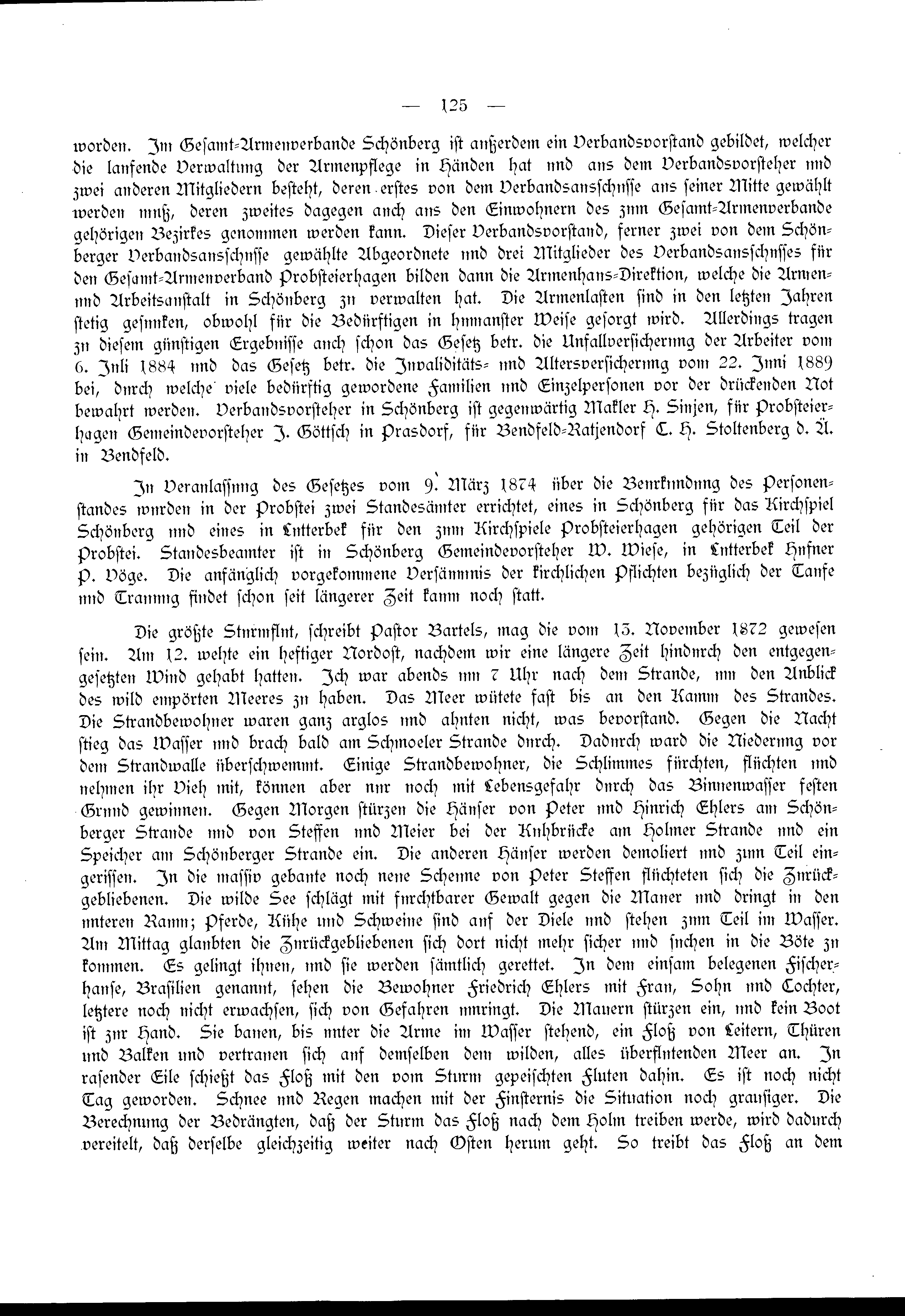 Die größte Sturmflut, schreibt Pastor Bartels, mag die vom 13. November 1872 gewesen sein. Am 12. wehte ein heftiger Nordost, nachdem wir eine längere Zeit hindurch den entgegengesetzten Wind gehabt hatten. Ich war abends um 7 Uhr nach dem Strande, um den Anblick des wild empörten Meeres zu haben. Das Meer wütete fast bis an den Kamm des Strandes. Die Strandbewohner waren ganz arglos und ahnten nicht, was bevorstand. Gegen die Nacht stieg das Wasser und brach bald am Schmoeler Strande durch. Dadurch ward die Niederung vor dem Strandwalle überschwemmt. Einige Strandbewohner, die Schlimmes fürchten, flüchten und nehmen ihr Vieh mit, können aber nur noch mit Lebensgefahr durch das Binnenwasser festen Grund gewinnen. Gegen Morgen stürzen die Häuser von Peter und Hinrich Ehlers am Schönberger Strande und von Steffen und Meier bei der Kuhbrücke am Holmer Strande und ein Speicher am Schönberger Strande ein. Die anderen Häuser werden demoliert und zum Teil eingerissen. In die massiv gebaute noch neue Scheune von Peter Steffen flüchteten sich die Zurückgebliebenen. Die wilde See schlägt mit furchtbarer Gewalt gegen die Mauer und dringt in den unteren Raum; Pferde, Kühe und Schweine sind auf der Diele und stehen zum Teil im Wasser. Am Mittag glaubten die Zurückgebliebenen sich dort nicht mehr sicher und suchen in die Böte zu kommen. Es gelingt ihnen, und sie werden sämtlich gerettet. In dem einsam belegenen Fischerhause, Brasilien genannt, sehen die Bewohner Friedrich Ehlers mit Frau, Sohn und Tochter, letztere noch nicht erwachsen, sich von Gefahren umringt. Die Mauern stürzen ein, und kein Boot ist zur Hand. Sie bauen, bis unter die Arme im Wasser stehend, ein Floß von Leitern, Thüren und Balken und vertrauen sich auf demselben dem wilden, alles überflutenden Meer an. In rasender Eile schießt das Floß mit den vom Sturm gepeischten Fluten dahin. Es ist noch nicht Tag geworden. Schnee und Regen machen mit der Finsternis die Situation noch grausiger. Die Berechnung der Bedrängten, daß der Sturm das Floß nach dem Holm treiben werde, wird dadurch vereitelt, daß derselbe gleichzeitig weiter nach Osten herum geht. So treibt das Floß an dem