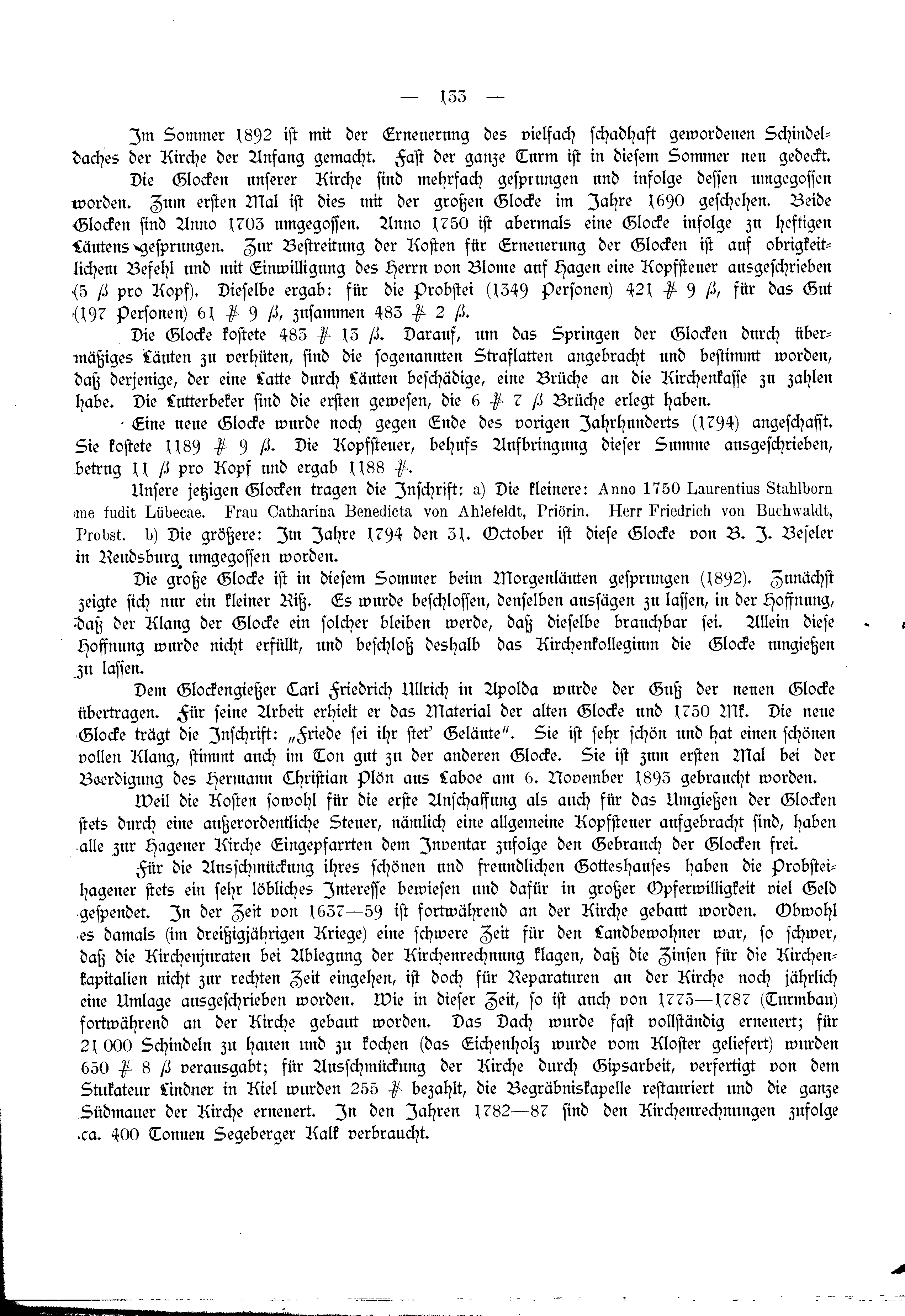 Die Glocken unserer Kirche sind mehrfach gesprungen und infolge dessen umgegossen worden. Zum ersten Mal ist dies mit der großen Glocke im Jahre 1690 geschehen. Beide Glocken sind Anno 1703 umgegossen. Anno 1750 ist abermals eine Glocke infolge zu heftigen Läutens gesprungen. Zur Bestreitung der Kosten für Erneuerung der Glocken ist auf obrigkeitlichem Befehl und mit Einwilligung des Herrn von Blome auf Hagen eine Kopfsteuer ausgeschrieben (5 β pro Kopf). Dieselbe ergab: für die Probstei (1349 Personen) 421
