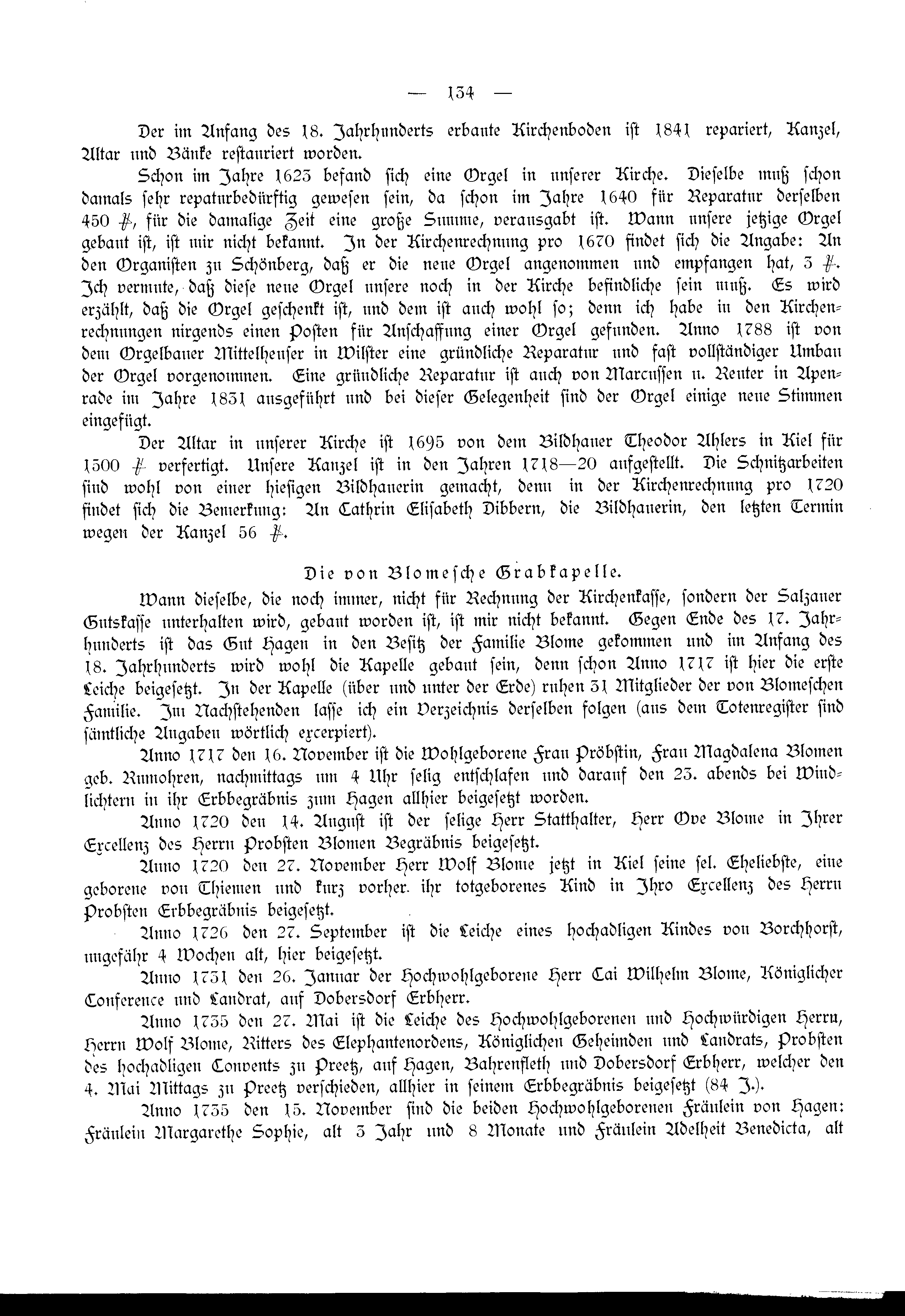 Wann dieselbe, die noch immer, nicht für Rechnung der Kirchenkasse, sondern der Salzauer Gutskasse unterhalten wird, gebaut worden ist, ist mir nicht bekannt. Gegen Ende des 17. Jahrhunderts ist das Gut Hagen in den Besitz der Familie Blome gekommen und im Anfang des 18. Jahrhunderts wird wohl die Kapelle gebaut sein, denn schon Anno 1717 ist hier die erste Leiche beigesetzt. In der Kapelle (über und unter der Erde) ruhen 31 Mitglieder der von Blomeschen Familie. Im Nachstehenden lasse ich ein Verzeichnis derselben folgen (aus dem Totenregister sind sämtliche Angaben wörtlich excerpiert).