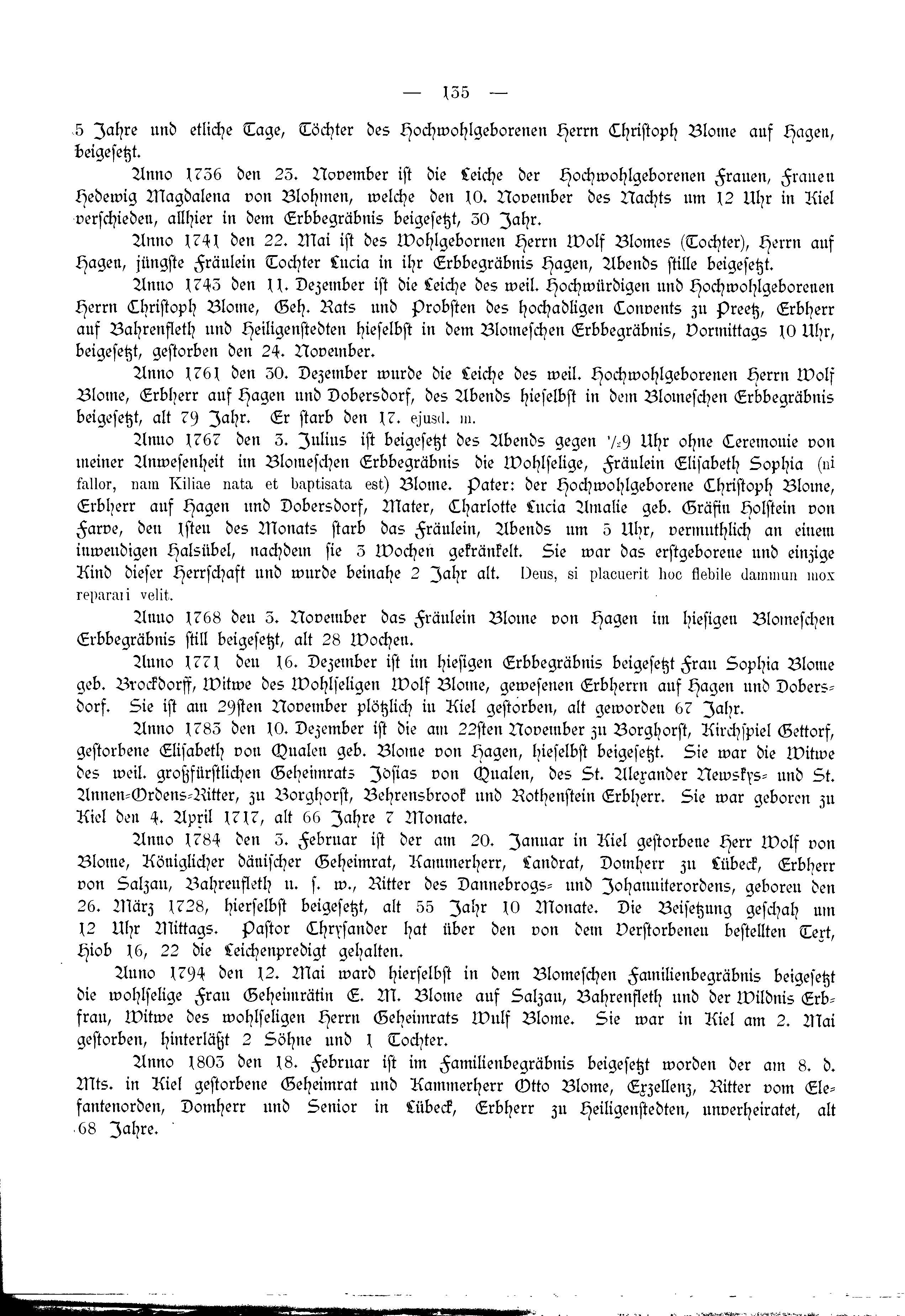 Anno 1768 den 3. Julius ist beigesetzt des Abends gegen ½9 Uhr ohne Ceremonie von meiner Anwesenheit im Blomeschen Erbbegräbnis die Wohlselige, Fräulein Elisabeth Sophia (ni fallor, nam Kiliae nata et baptisata est) Blome. Pater: der Hochwohlgeborene Christoph Blome, Erbherr auf Hagen und Dobersdorf, Mater, Charlotte Lucia Amalie geb. Gräfin Holstein von Farve, den 1sten des Monats starb das Fräulein, Abends um 5 Uhr, vermuthlich an einem inwendigen Halsübel, nachdem sie 3 Wochen gekränkelt. Sie war das erstgeborene und einzige Kind dieser Herrschaft und wurde beinahe 2 Jahr alt. Deus, si placuerit hoc flebile dammun mox reparari velit.