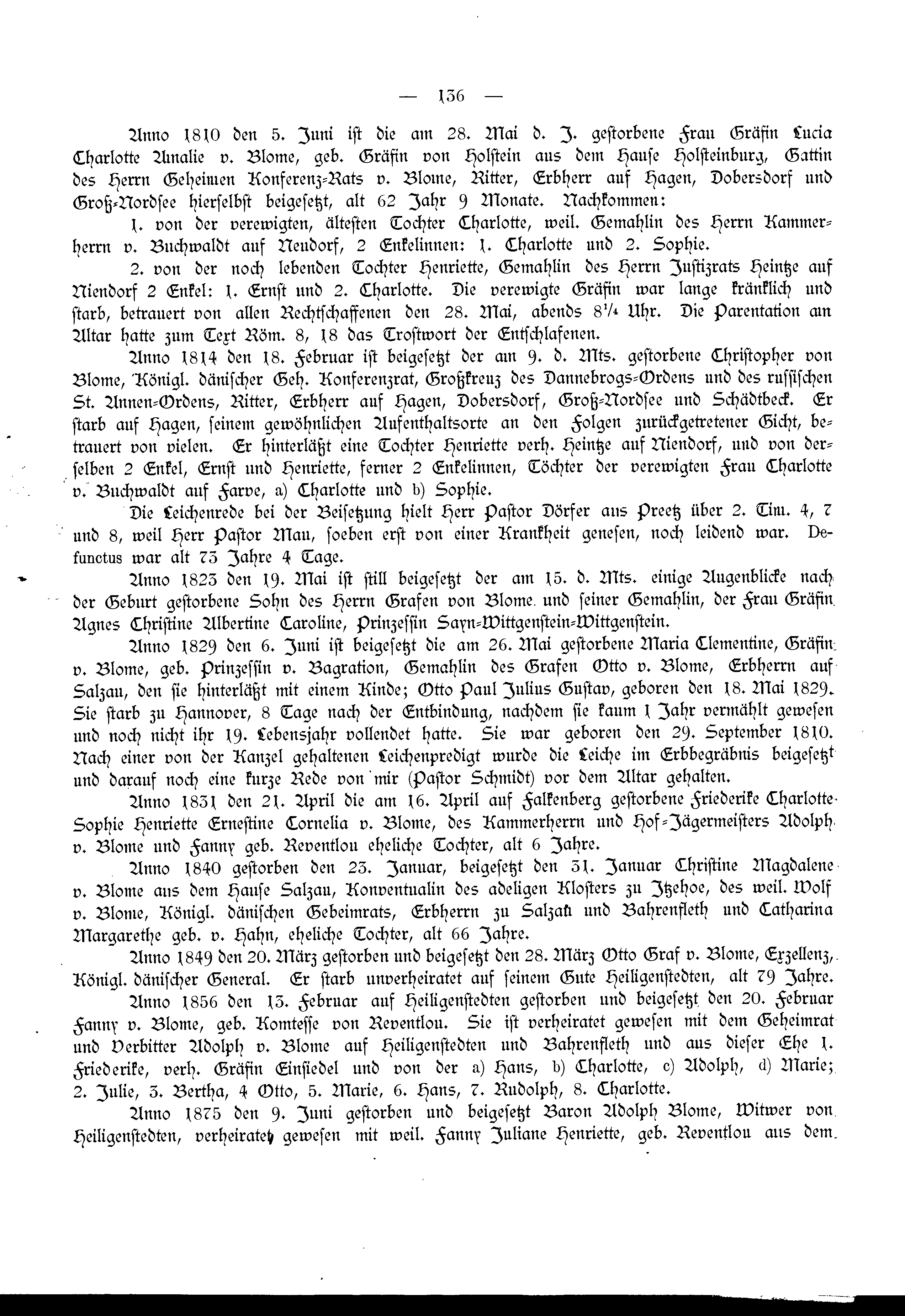 Anno 1856 den13. Februar auf Heiligenstedten gestorben und beigesetzt den 20. Februar Fanny v. Blome, geb. Komtesse von Reventlou.Sie ist verheiratet gewesen mit dem Geheimrat und Verbitter Adolph v. Blome auf Heiligenstedten und Bahrenfleth und aus dieser Ehe 1. Friederike, verh. Gräfin Einsiedel und von der a) Hans, b) Charlotte, c) Adolph, d) Marie; 2. Julie, 3. Bertha, 4 Otto, 5. Marie 6. Hans, 7. Rudolph, 8. Charlotte.