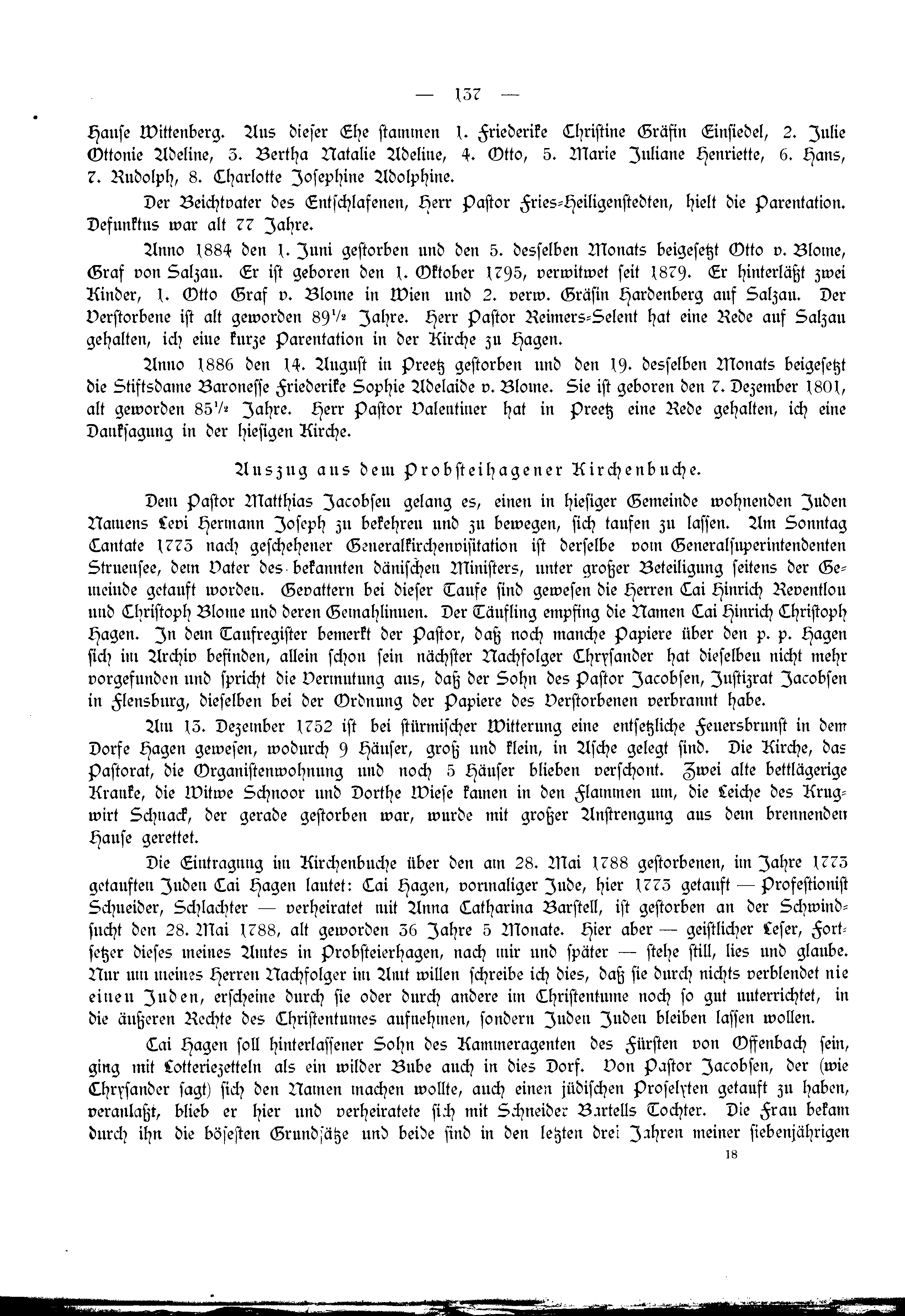 Die Eintragung im Kirchenbuche über den am 28. Mai 1788 gestorbenen, im Jahre 1773 getauften Juden Cai Hagen lautet: Cai Hagen, vormaliger Jude, hier 1773 getauft – Profestionist Schneider, Schlachter - verheiratet mit Anna Catharina Barstell, ist gestorben an der Schwindsucht den 28. Mai 1788, alt geworden 36 Jahre 5 Monate. Hier aber - geistlicher Leser, Fortsetzer dieses meines Amtes in Probsteierhagen, nach mir und später - stehe still, lies und glaube. Nur um meines Herren Nachfolger im Amt willen schreibe ich dies, daß sie durch nichts verblendet nie einen Juden, erscheine durch sie oder durch andere im Christentume noch so gut unterrichtet, in die äußeren Rechte des Christentums aufnehmen, sondern Juden Juden bleiben lassen wollen.