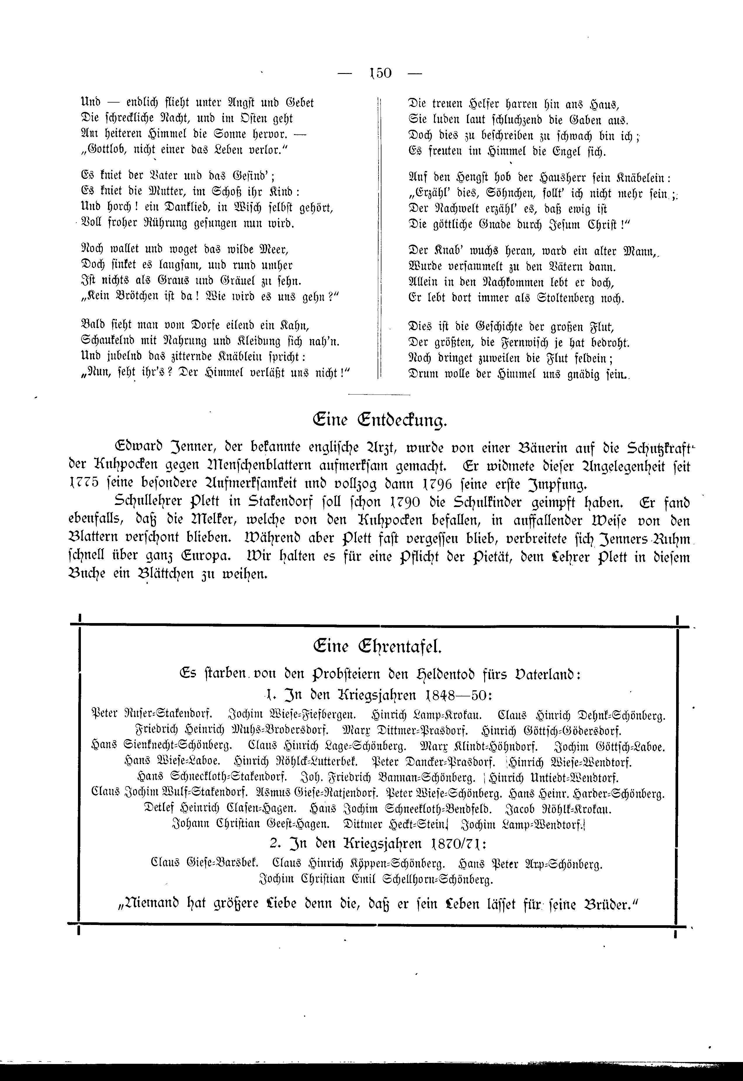 Eine Ehrentafel.Es starben von den Probsteiern den Heldentod fürs Vaterland: 1. In den Kriegsjahren 1848–50: Peter Ruser-Stakendorf. Jochim Wiese-Fiefbergen. Hinrich Lamp-Krokau. Claus Hinrich Dehnk Schönberg. Friedrich Heinrich Muhs-Brodersdorf. Marx Dittmer-Prasdorf. Hinrich Göttsch-Gödersdorf. Hans Sienknecht-Schönberg. Claus Hinrich Lage-Schönberg. Marx Klindt-Höhndorf. Jochim Göttsch-Laboe. Hans Wiese-Laboe. Hinrich Röhlck-Lutterbek. Peter Dancker-Prasdorf. Hinrich Wiese-Wendtorf. Hans Schneekloth-Stakendorf. Joh. Friedrich Bannan-Schönberg. Hinrich Untiedt-Wendtorf. Claus Jochim Wulf-Stakendorf. Asmus Giese-Ratjendorf. Peter Wiese-Schönberg. Hans Heinr. Harder-Schönberg. Detlef Heinrich Clasen-Hagen. Hans Jochim Schneekloth-Bendfeld. Jacob Röhlk-Krokau. Johann Christian Geest-Hagen. Dittmer Heckt-Stein. Jochim Lamp-Wendtorf. 2. In den Kriegsjahren 1870/71: Claus Giese-Barsbek. Claus Hinrich Köppen-Schönberg. Hans Peter Arp-Schönberg. Jochim Christian Emil Schellhorn-Schönberg. „Niemand hat größere Liebe denn die, daß er sein Leben lässet für seine Brüder.“ |