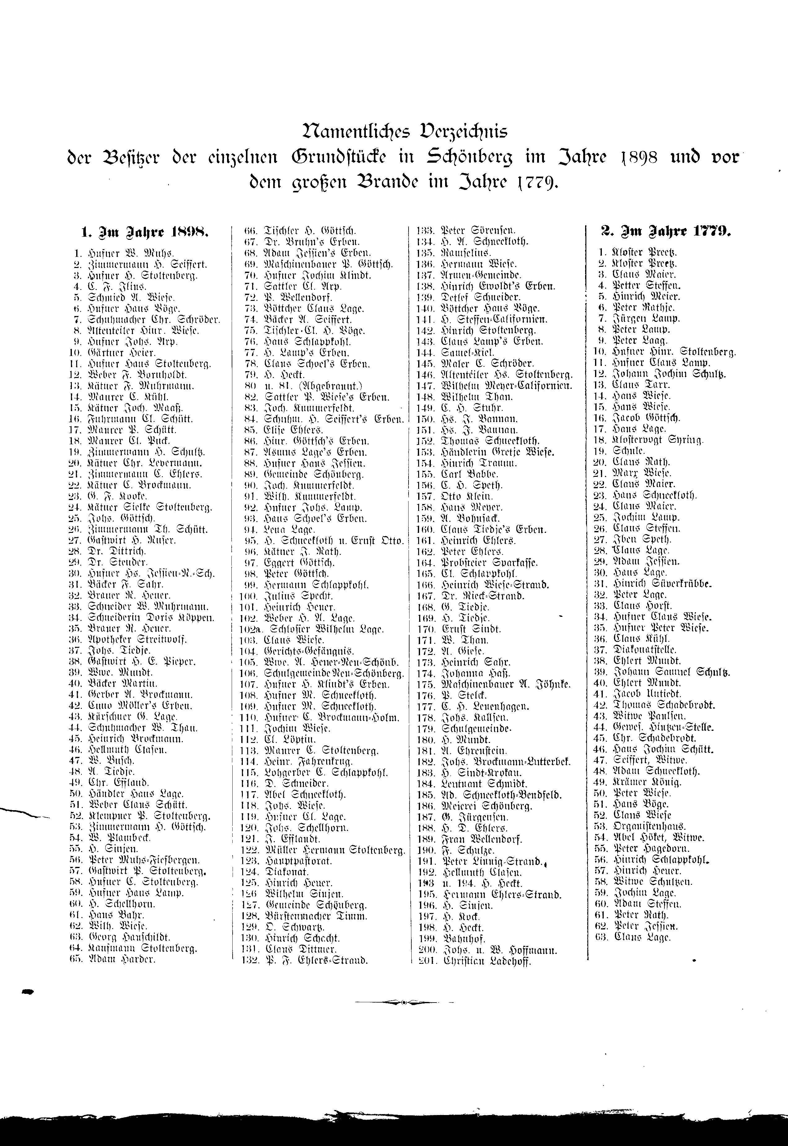 der Besitzer der einzelnen Grundstücke in Schönberg im Jahre 1898 und vor dem großen Brande im Jahre 1779.