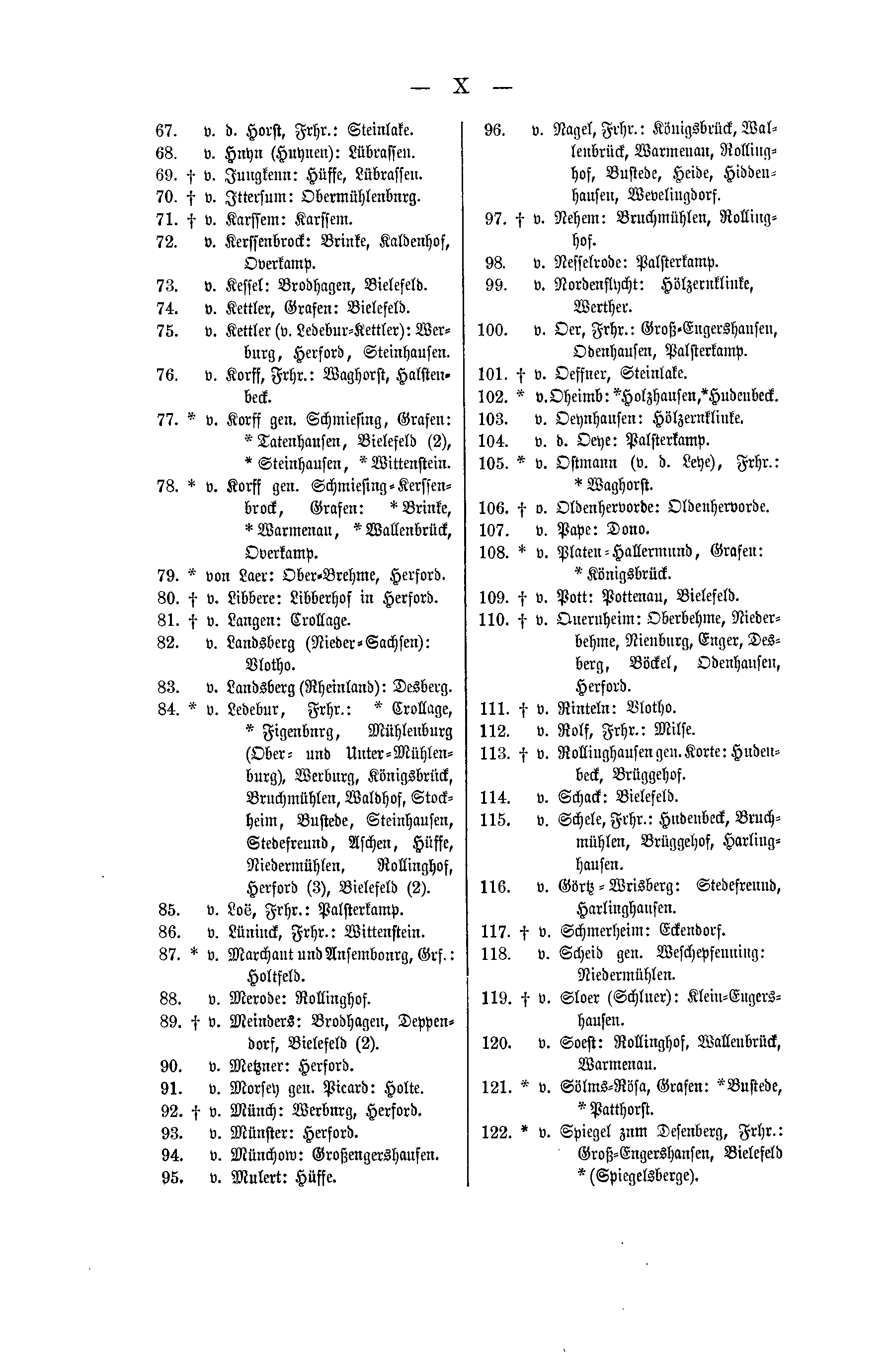 67. v. d. Horst, Frhr.: Steinlake. 68. v. Huyn (Huynen): Lübrassen. 69. † v. Jungkenn: Hüffe, Lübrassen. 70. † v. Ittersum: Obermühlenburg. 71. † v. Karssem: Karssem. 72. v. Kerßenbrock: Brinke, Kaldenhof, Overkamp. 73. v. Kessel: Brodhagen, Bielefeld. 74. v. Kettler, Grafen: Bielefeld. 75. v. Kettler (v. Ledebur-Kettler): Werburg, Herford, Steinhausen. 76. v. Korff, Frhr.: Waghorst, Halstenbeck. 77. * v. Dorff gen. Schmiesing, Grafen: * Tatenhausen, Bielefeld (2), * Steinhausen, * Wittenstein. 78. * v. Dorff gen. Schmiesing-Kerssenbrock, Grafen: * Brinke, * Warmenau, * Wallenbrück, Overkamp. 79. * von Laer: Ober-Brehme, Herford. 80. † v. Libbere: Libberhof in Herford. 81. † v. Langen: Crollage. 82. v. Landsberg (Nieder-Sachsen): Vlotho. 83. v. Landsberg (Rheinland): Desberg. 84. * v. Ledebur, Frhr.: * Crollage, * Figenburg, Mühlenburg (Ober- und Unter-Mühlenburg), Werburg, Königsbrück, Bruchmühlen, Waldhof, Stockheim, Bustede, Steinhausen, Stedesreund, Aschen, Hüffe, Niedermühlen, Rollinghof, Herford (3), Bielefeld (2). 85. v. Loë, Frhr.: Palsterkamp. 86. v. Lüninck, Frhr.: Wittenstein. 87. * v. Marchant und Ausembourg, Grf.: Holtfeld. 88. v. Merode: Rollinghof. 89. † v. Meinders: Brodhagen, Deppendorf, Bielefeld (2). 90. v. Metzner: Herford. 91. v. Morfey gen. Picard: Holte. 92. † v. Münch: Werburg, Herford. 93. v. Münster: Herford. 94. v. Münchow: Großengershausen. 95. v. Mulert: Hüffe. |
