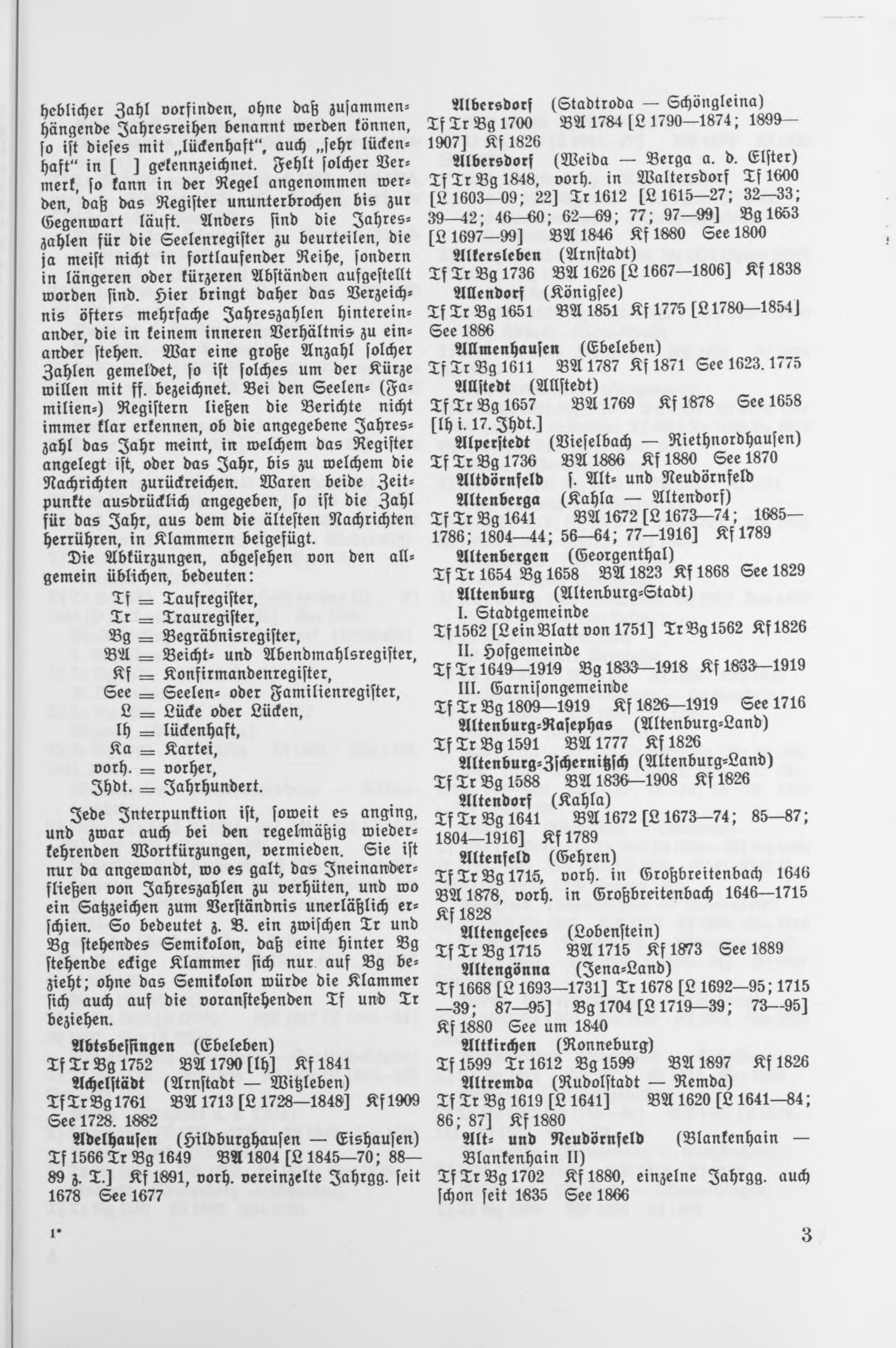 Jede Interpunktion ist, soweit es anging, und zwar auch bei den regelmäßig wiederkehrenden Wortkürzungen, vermieden. Sie ist nur da angewandt, wo es galt, das Ineinanderfließen von Jahreszahlen zu verhüten, und wo ein Satzzeichen zum Verständnis unerläßlich erschien. So bedeutet z. B. ein zwischen Tr und Bg stehendes Semikolon, daß eine hinter Bg stehende eckige Klammer sich nur. auf Bg bezieht; ohne das Semikolon würde die Klammer sich auch auf die voranstehenden Tf unsd Tr beziehen. Abtsbessingen (Ebeleben) Achelstädt (Arnstadt – Witzleben) Adelhausen (Hildburghausen – Eishausen) |