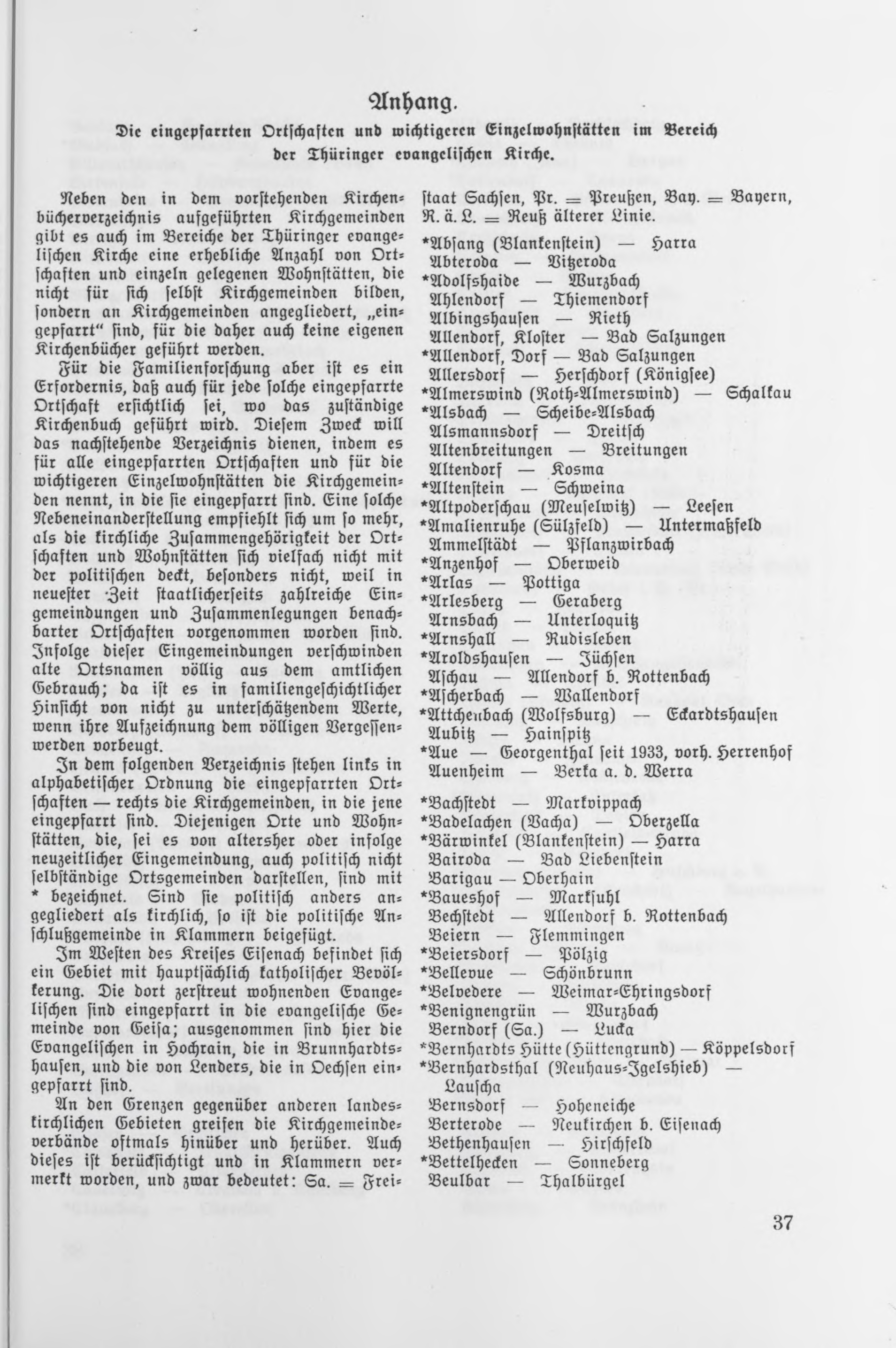Neben den in dem vorstehenden Kirchenbücherverzeichnis ausgeführten Kirchgemeinden gibt es auch im Bereiche der Thüringer evangelischen Kirche eine erhebliche Anzahl von Ortschaften und einzeln gelegenen Wohnstätten, die nicht für sich selbst Kirchgemeinden bilden, sondern an Kirchgemeinden angegliedert, „eingepfarrt“ sind, für die daher auch keine eigenen Kirchenbücher geführt werden. Für die Familiensorschung aber ist es ein Erfordernis, daß auch für jede solche eingepfarrte Ortschaft ersichtlich sei, wo das zuständige Kirchenbuch geführt wird. Diesem Zweck will das nachstehende Verzeichnis dienen, indem es für alle eingepfarrten Ortschaften und für die wichtigeren Einzelwohnstätten die Kirchgemeinden nennt, in die sie eingepfarrt sind. Eine solche Nebeneinanderstellung empfiehlt sich um so mehr, als die tirchliche Zusammengehörigkeit der Ortschaften und Wohnstätten sich vielfach nicht mit der politischen deckt, besonders nicht, weil in neuester Zeit staatlicherseits zahlreiche Eingemeindungen und Zusammenlegungen benachbarter Ortschaften vorgenommen worden sind. Infolge dieser Eingemeindungen verschwinden alte Ortsnamen völlig aus dem amtlichen Gebrauch; da ist es in familiengeschichtlicher Hinsicht von nicht zu unterschätzendem Werte, wenn ihre Auszeichnung dem völligen Vergessenwerden vorbeugt. In dem folgenden Verzeichnis stehen links in alphabetischer Ordnung die eingepfarrten Ortschaften – rechts die Kirchgemeinden, in die jene eingepfarrt sind. Diejenigen Orte und Wohnstätten, die, sei es von altersher oder infolge neuzeitlicher Eingemeindung, auch politisch nicht selbständige Ortsgemeinden darstellen, sind mit * bezeichnet. Sind sie politisch anders angegliedert als kirchlich, so ist die politische Anschlußgemeinde in Klammern beigefügt. Im Westen des Kreises Eisenach befindet sich ein Gebiet mit hauptsächlich katholischer Bevölkerung. Die dort zerstreut wohnenden Evangelischen sind eingepfarrt in die evangelische Gemeinde von Geisa; ausgenommen sind hier die Evangelischen in Hochrain, die in Brunnhardtshausen, und die von Lenders, die in Oechsen eingepfarrt sind. An den Grenzen gegenüber anderen landeskirchlichen Gebieten greifen die Kirchgemeindeverbände oftmals hinüber und herüber. Auch dieses ist berücksichtigt und in Klammern vermerkt worden, und zwar bedeutet: Sa. = Freistaat |