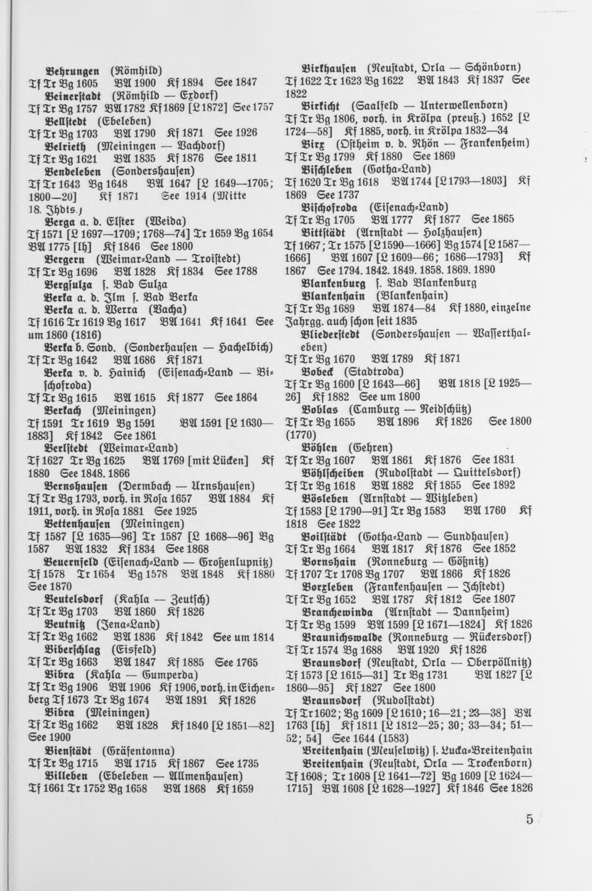 Birkhausen (Neustadt, Orla – Schönborn) Birkicht (Saalfeld – Unterwellenborn) Birx (Ostheim v. d. Rhön – Frankenheim) Bischleben (Gotha-Land) Bischofroda (Eisenach-Land) Bittstädt (Arnstadt – Holzhausen) Blankenburg s. Bad Blankenburg Blankenhain (Blankenhain) Bliederstedt (Sondershausen – Wasserthaleben) Bobeck (Stadtroda) Boblas (Gamburg – Neidschütz) Böhlen (Gehren) Böhlscheiben (Rudolstadt – Quittelsdorf) Bösleben (Arnstadt – Witzleben) Boilstädt (Gotha-Land – Sundhausen) Bornshain (Ronneburg – Gößnitz) Borxleben (Frankenhausen – Ichstedt) Branchewinda (Arnstadt – Dannheim) Braunichswalde (Ronneburg – Rückersdorf) Braunsdorf (Neustadt, Orla – Oberpöllnitz) Braunsdorf (Rudolstadt) Tf Tr 1602; Bg 1609 [531610;16–21;B–38] BA 1763 [lh] Kf 1811 [L 1812–25; 30; 33–34; 51–52; 541 See 1644 (1583) Breitenhain (Meuselwitz) s. Lucka-Breitenhain Breitenhain (Neustadt, Orla – Trockenborn) |