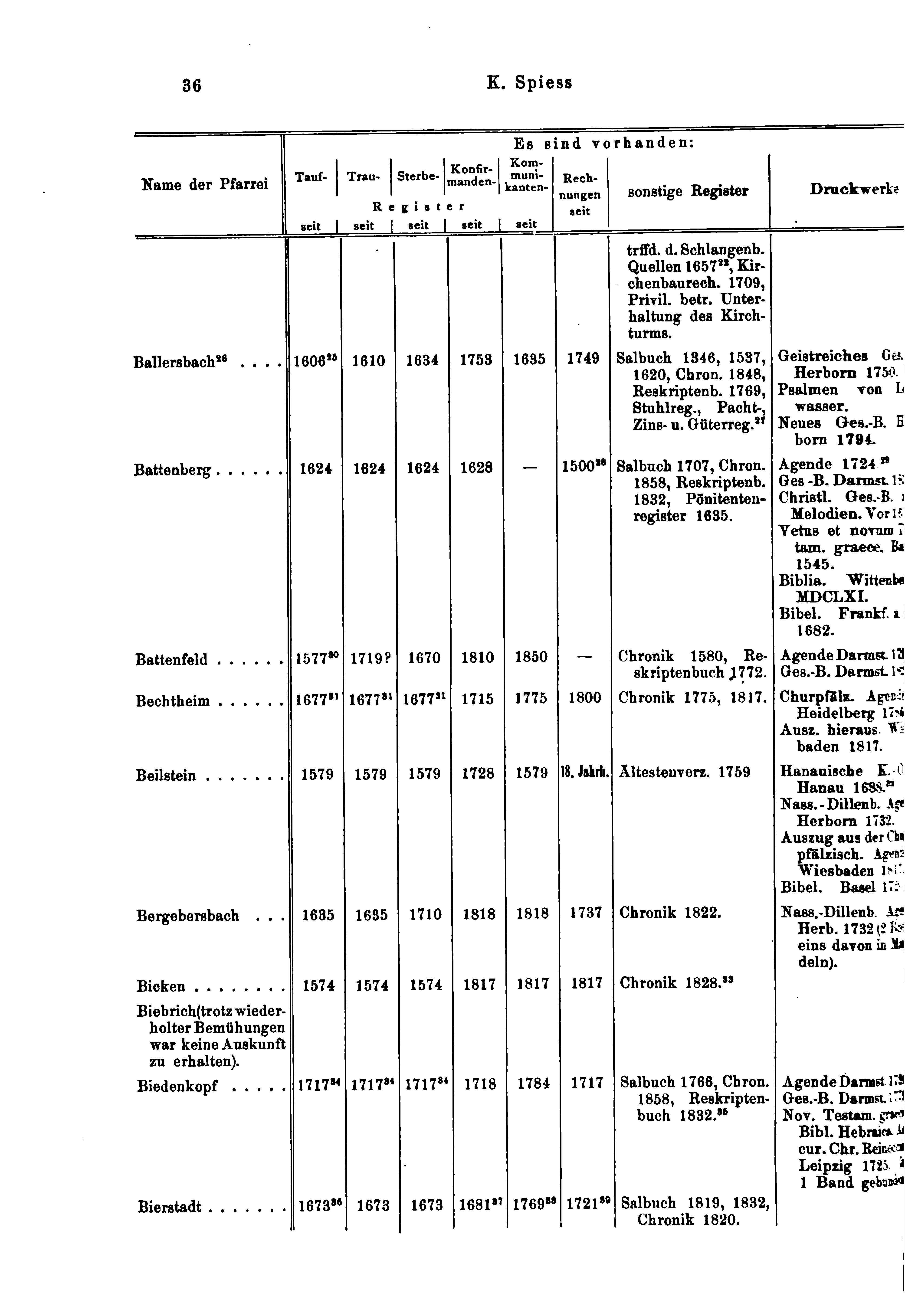 | Battenfeld | 1577 Anm. 30 | 1719? | 1670 | 1810 | 1850 | - | Chronik 1580, Reskriptenbuch 1772. | Agende Darmst. 1?? Ges.-B. Darmst. 1 ??. |