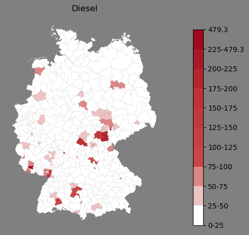 Relative Verteilung des Namens Diesel (1996)Direkt zur Karte Die Farbskala zeigt die Anzahl von "Diesel" bezogen auf je 1 Million Einträge. |