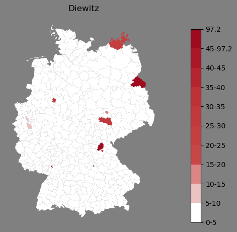 Relative Verteilung des Namens Diewitz (1996)Direkt zur Karte Die Farbskala zeigt die Anzahl von "Diewitz" bezogen auf je 1 Million Einträge. |