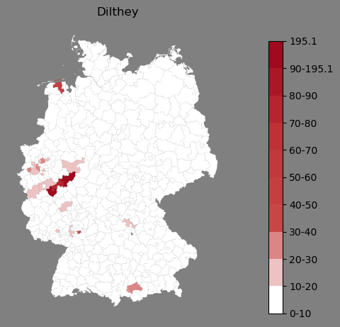 Relative Verteilung des Namens Dilthey (1996)Direkt zur Karte Die Farbskala zeigt die Anzahl von "Dilthey" bezogen auf je 1 Million Einträge. |