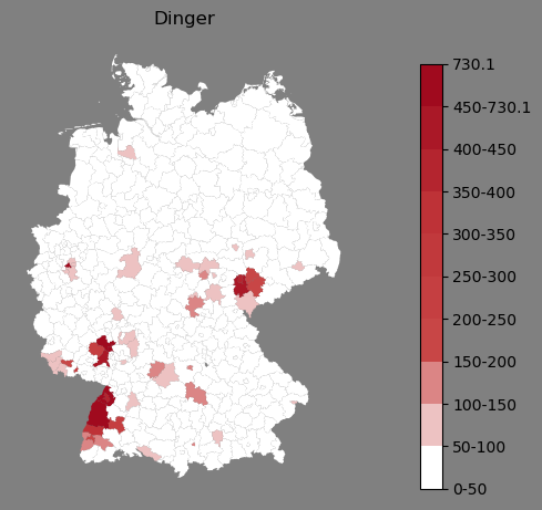 Relative Verteilung des Namens Dinger (1996)Direkt zur Karte Die Farbskala zeigt die Anzahl von "Dinger" bezogen auf je 1 Million Einträge. |