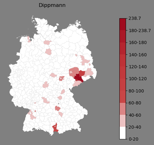 Relative Verteilung des Namens Dippmann (1996)Direkt zur Karte Die Farbskala zeigt die Anzahl von "Dippmann" bezogen auf je 1 Million Einträge. |