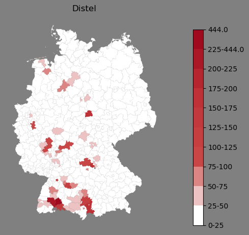 Relative Verteilung des Namens Distel (1996)Direkt zur Karte Die Farbskala zeigt die Anzahl von "Distel" bezogen auf je 1 Million Einträge. |