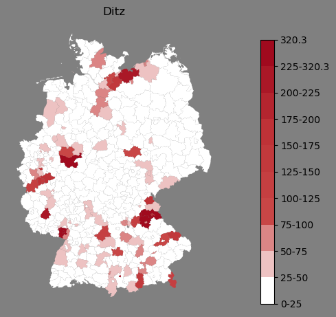 Relative Verteilung des Namens Ditz (1996)Direkt zur Karte Die Farbskala zeigt die Anzahl von "Ditz" bezogen auf je 1 Million Einträge. |