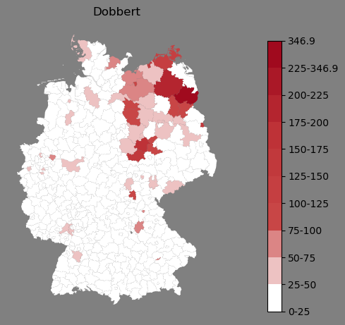 Relative Verteilung des Namens Dobbert (1996)Direkt zur Karte Die Farbskala zeigt die Anzahl von "Dobbert" bezogen auf je 1 Million Einträge. |