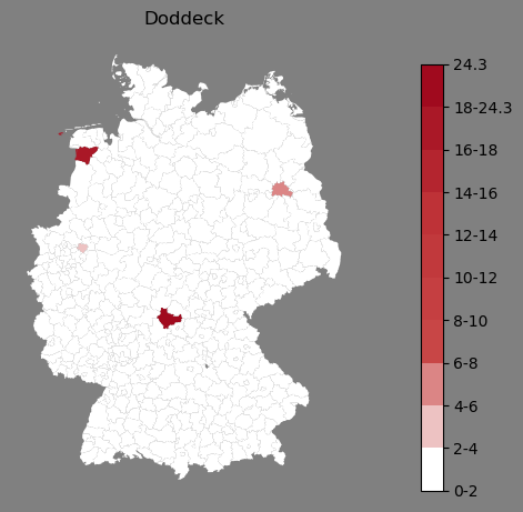 Relative Verteilung des Namens Doddeck (1996)Direkt zur Karte Die Farbskala zeigt die Anzahl von "Doddeck" bezogen auf je 1 Million Einträge. |