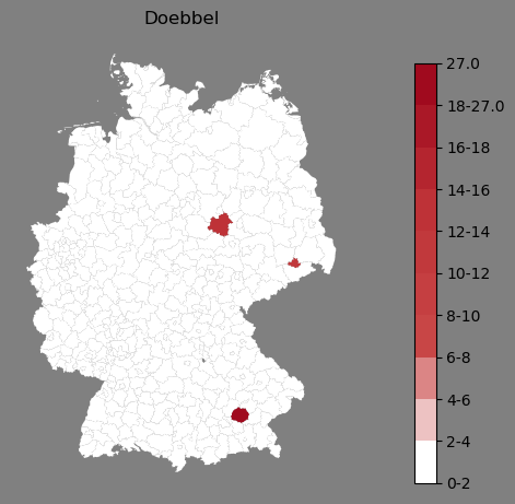 Relative Verteilung des Namens Doebbel (1996)Direkt zur Karte Die Farbskala zeigt die Anzahl von "Doebbel" bezogen auf je 1 Million Einträge. |