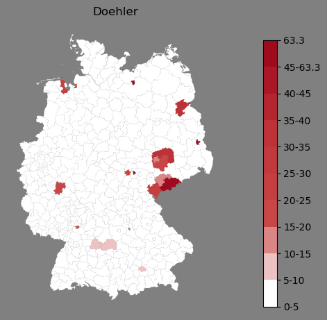 Relative Verteilung des Namens Doehler (1996)Direkt zur Karte Die Farbskala zeigt die Anzahl von "Doehler" bezogen auf je 1 Million Einträge. |