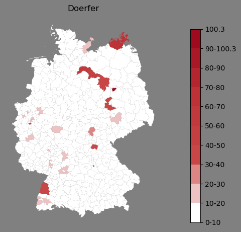 Relative Verteilung des Namens Doerfer (1996)Direkt zur Karte Die Farbskala zeigt die Anzahl von "Doerfer" bezogen auf je 1 Million Einträge. |