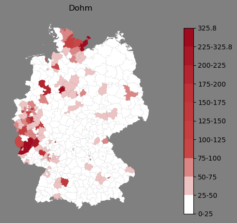 Relative Verteilung des Namens Dohm (1996)Direkt zur Karte Die Farbskala zeigt die Anzahl von "Dohm" bezogen auf je 1 Million Einträge. |