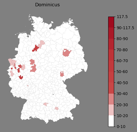 Relative Verteilung des Namens Dominicus (1996)Direkt zur Karte Die Farbskala zeigt die Anzahl von "Dominicus" bezogen auf je 1 Million Einträge. |