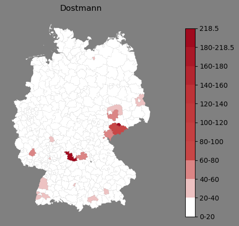 Relative Verteilung des Namens Dostmann (1996)Direkt zur Karte Die Farbskala zeigt die Anzahl von "Dostmann" bezogen auf je 1 Million Einträge. |