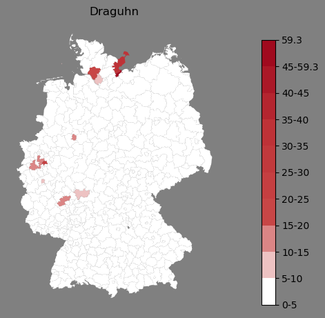 Relative Verteilung des Namens Draguhn (1996)Direkt zur Karte Die Farbskala zeigt die Anzahl von "Draguhn" bezogen auf je 1 Million Einträge. |
