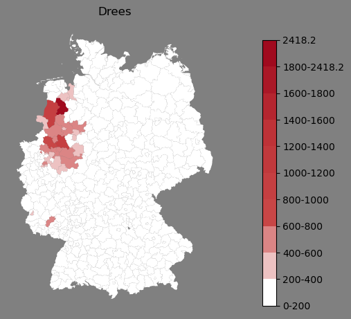 Relative Verteilung des Namens Drees (1996)Direkt zur Karte Die Farbskala zeigt die Anzahl von "Drees" bezogen auf je 1 Million Einträge. |