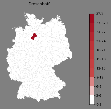 Relative Verteilung des Namens Dreschhoff (1996)Direkt zur Karte Die Farbskala zeigt die Anzahl von "Dreschhoff" bezogen auf je 1 Million Einträge. |