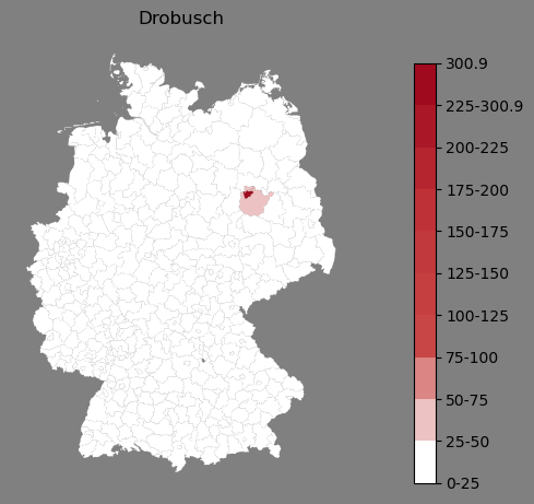 Relative Verteilung des Namens Drobusch (1996)Direkt zur Karte Die Farbskala zeigt die Anzahl von "Drobusch" bezogen auf je 1 Million Einträge. |