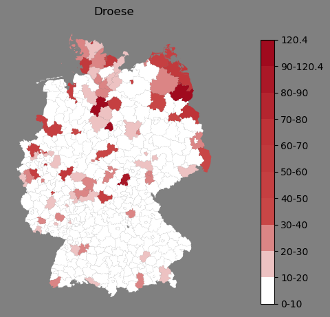 Relative Verteilung des Namens Droese (1996)Direkt zur Karte Die Farbskala zeigt die Anzahl von "Droese" bezogen auf je 1 Million Einträge. |